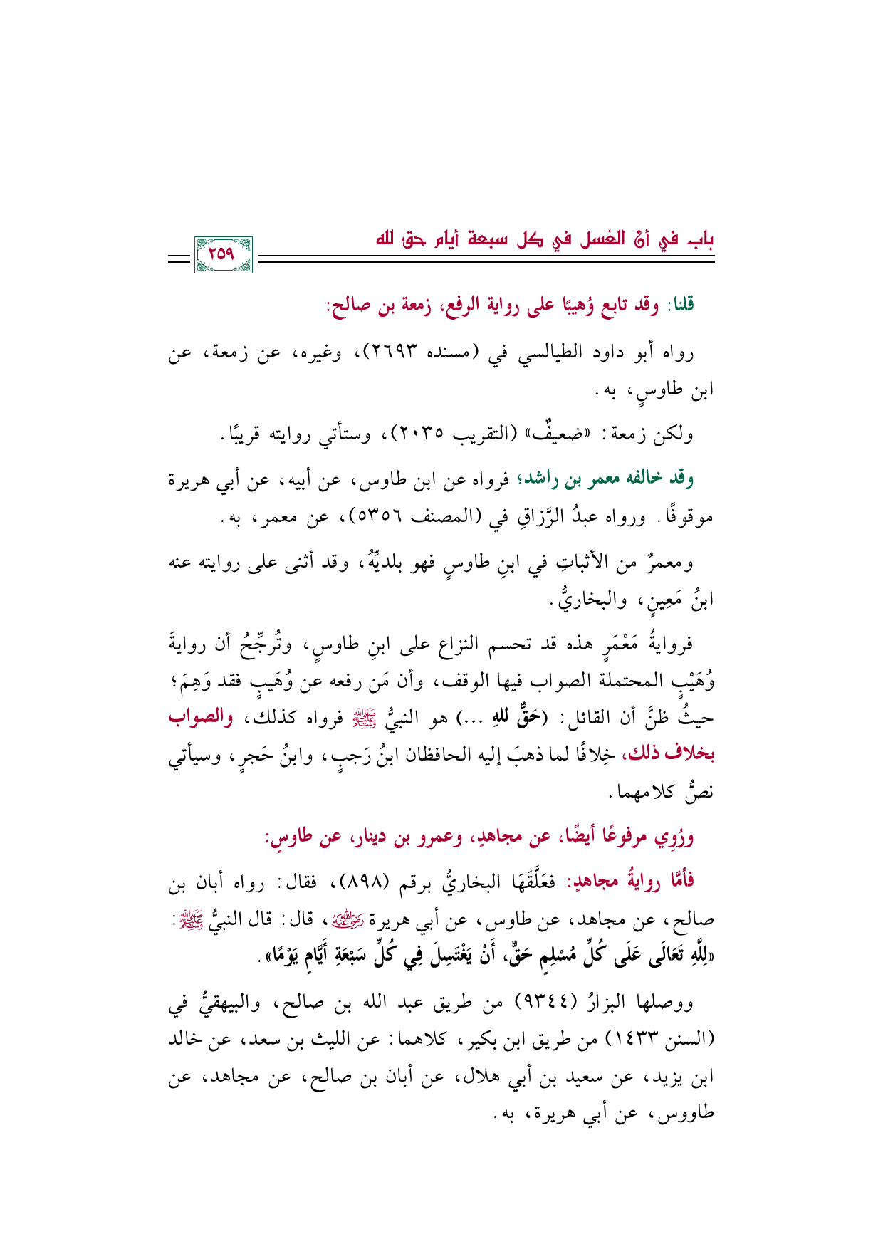 فروايةُ مَعْمَرٍ هذه قد تحسم النزاع على ابنِ طاوسٍ، وتُرجِّحُ أن روايةَ وُهَيْبٍ المحتملة الصواب فيها الوقف، وأن مَن رفعه عن وُهَيبٍ فقد وَهِمَ؛ حيثُ ظنَّ أن القائل: (حَقٌّ للهِ ... ) هو النبيُّ صلى الله عليه وسلم فرواه كذلك، والصواب بخلاف ذلك، خِلافًا لما ذهبَ إليه الحافظان ابنُ رَجبٍ، وابنُ حَجرٍ، وسيأتي نصُّ كلامهما.