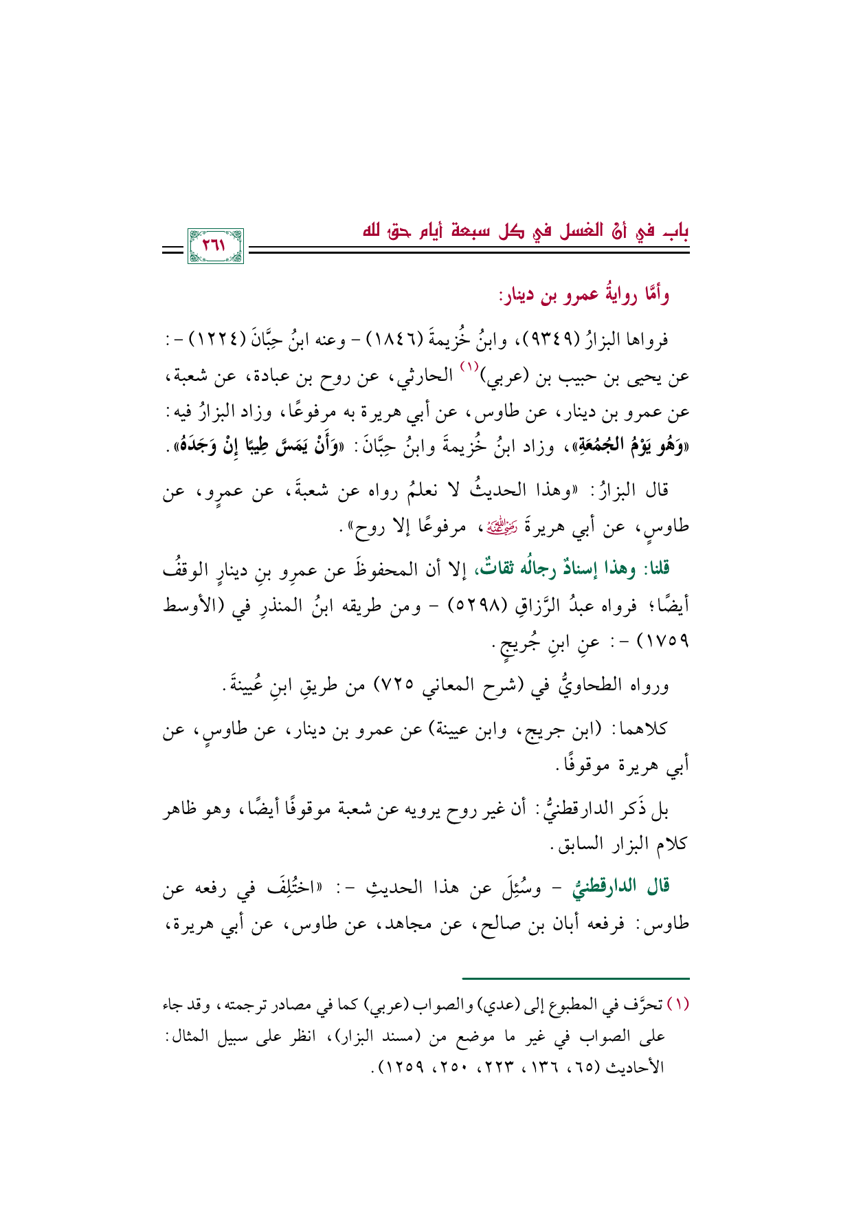 فرواها البزارُ (٩٣٤٩)، وابنُ خُزيمةَ (١٨٤٦) -وعنه ابنُ حِبَّانَ (١٢٢٤) -: عن يحيى بن حبيب بن (عربي) (¬١) الحارثي، عن روح بن عبادة، عن شعبة، عن عمرو بن دينار، عن طاوس، عن أبي هريرة به مرفوعًا، وزاد البزارُ فيه: ((وَهُو يَوْمُ الجُمُعَةِ))، وزاد ابنُ خُزيمةَ وابنُ حِبَّانَ: ((وَأَنْ يَمَسَّ طِيبًا إِنْ وَجَدَهُ)).