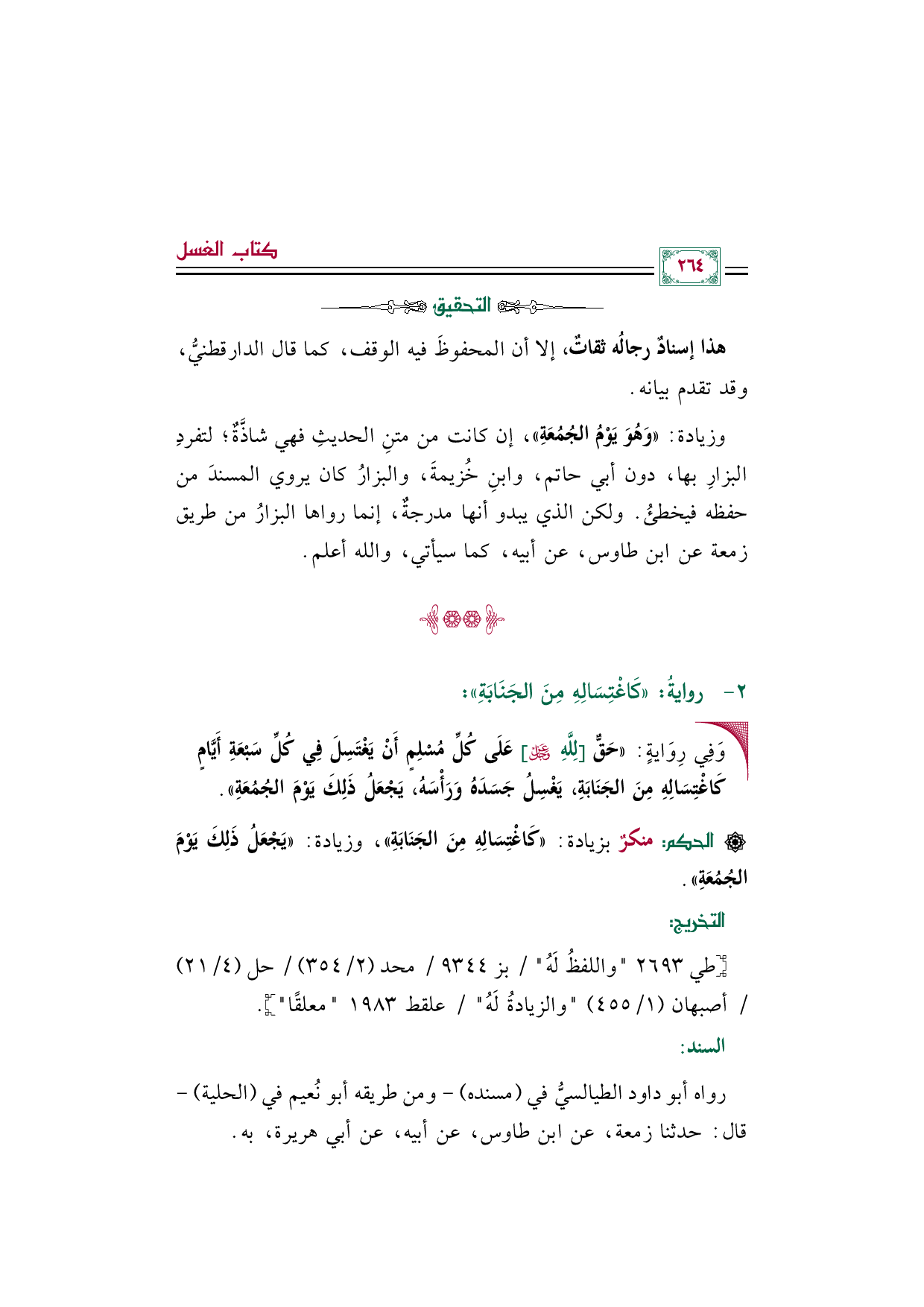 وزيادة: ((وَهُوَ يَوْمُ الجُمُعَةِ))، إن كانت من متنِ الحديثِ فهي شاذَّةٌ؛ لتفردِ البزارِ بها، دون أبي حاتم، وابنِ خُزيمةَ، والبزارُ كان يروي المسندَ من حفظه فيخطئُ. ولكن الذي يبدو أنها مدرجةٌ، إنما رواها البزارُ من طريق زمعة عن ابن طاوس، عن أبيه، كما سيأتي، والله أعلم.