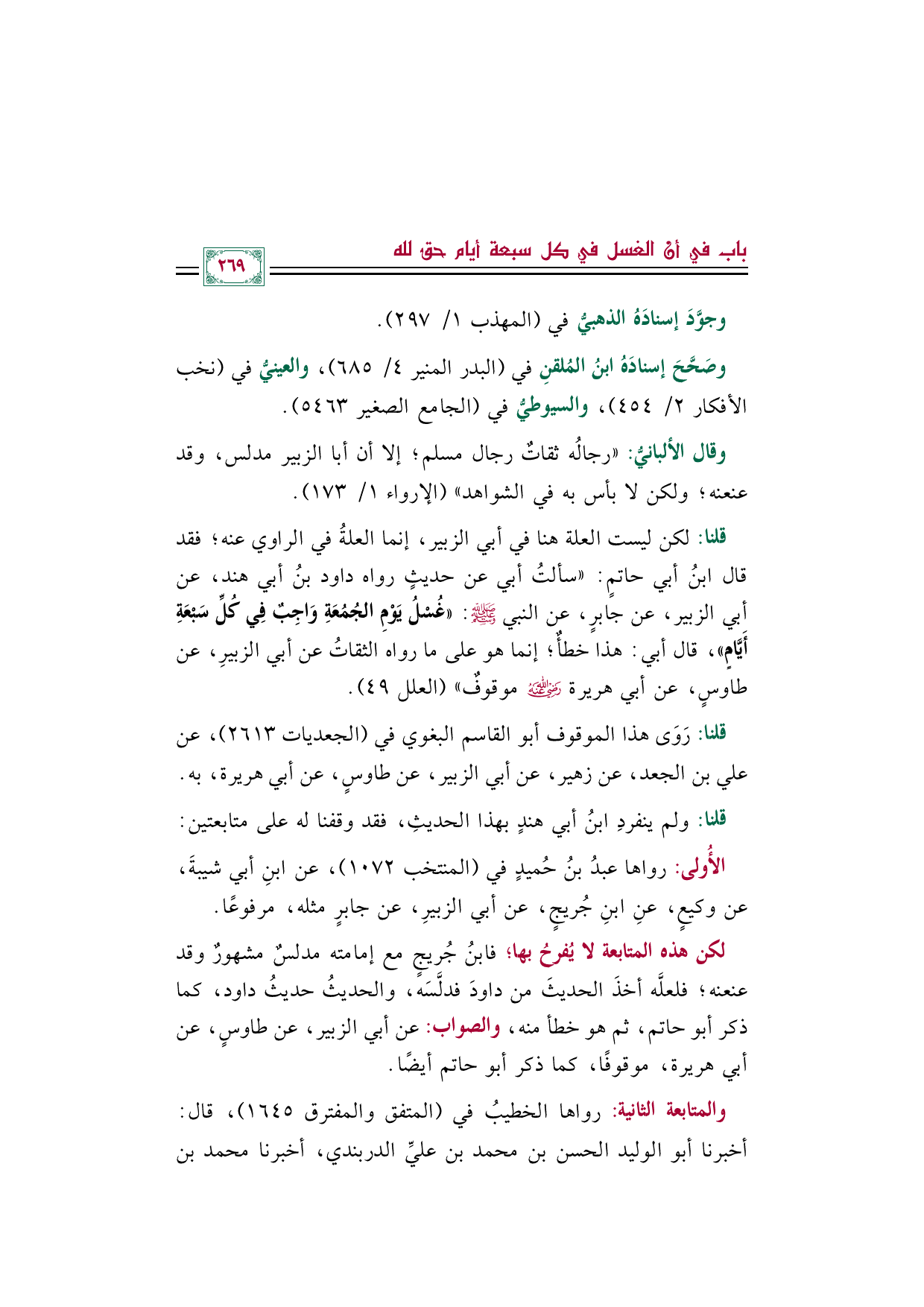 قلنا: لكن ليست العلة هنا في أبي الزبير، إنما العلةُ في الراوي عنه؛ فقد قال ابنُ أبي حاتمٍ: "سألتُ أبي عن حديثٍ رواه داود بنُ أبي هند، عن أبي الزبير، عن جابرٍ، عن النبي صلى الله عليه وسلم: ((غُسْلُ يَوْمِ الجُمُعَةِ وَاجِبٌ فِي كُلِّ سَبْعَةِ أَيَّامٍ))، قال أبي: هذا خطأٌ؛ إنما هو على ما رواه الثقاتُ عن أبي الزبيرِ، عن طاوسٍ، عن أبي هريرة رضي الله عنه موقوفٌ" (العلل ٤٩).