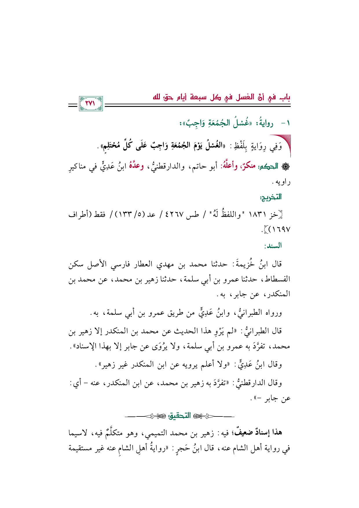 وقال الدارقطنيُّ: "تفرَّدَ به زهير بن محمد، عن ابن المنكدر، عنه-أي: عن جابر-".