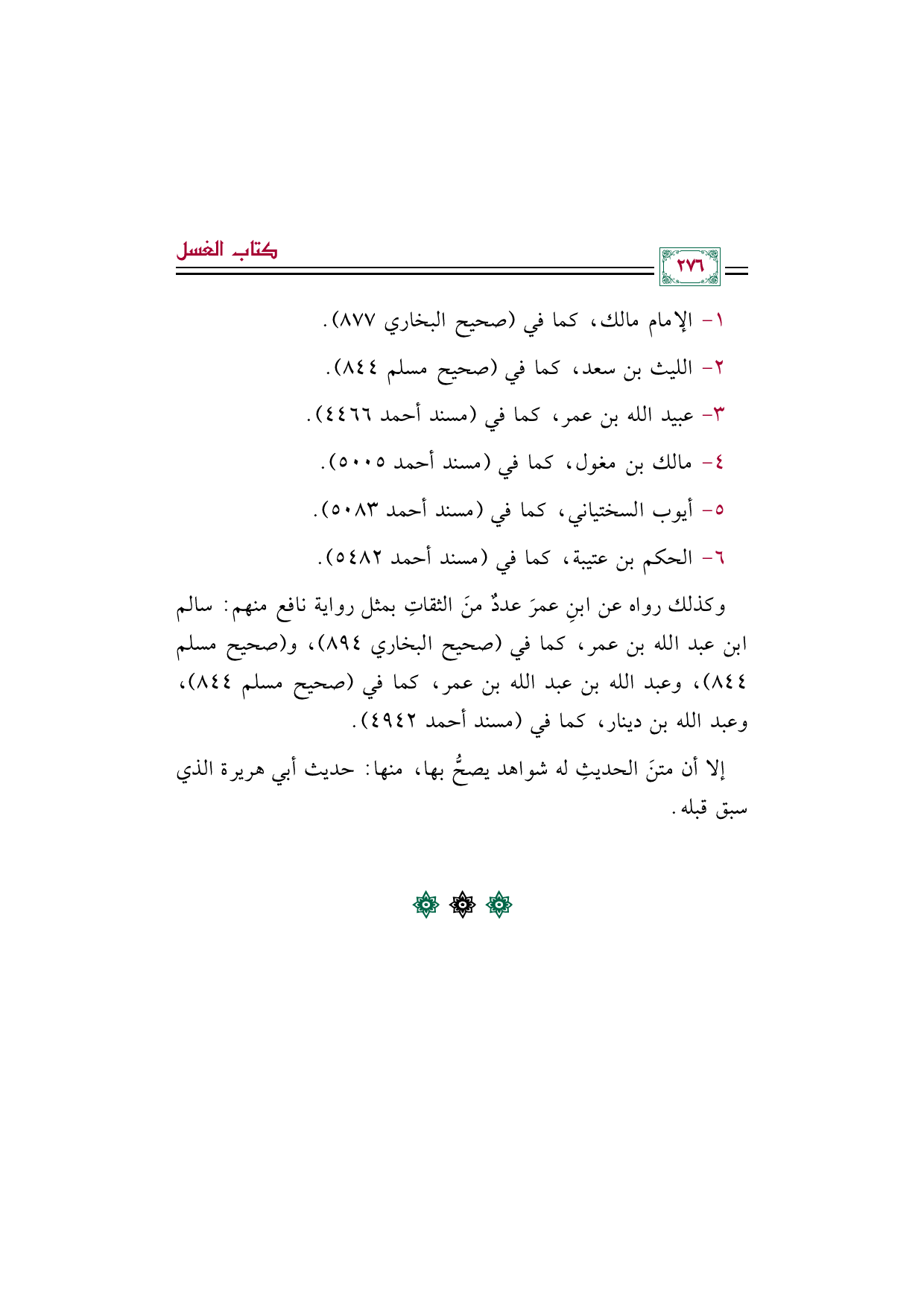 وكذلك رواه عن ابنِ عمرَ عددٌ منَ الثقاتِ بمثل رواية نافع منهم: سالم بن عبد الله بن عمر، كما في (صحيح البخاري ٨٩٤)، و (صحيح مسلم ٨٤٤)، وعبد الله بن عبد الله بن عمر، كما في (صحيح مسلم ٨٤٤)، وعبد الله بن دينار، كما في (مسند أحمد ٤٩٤٢).