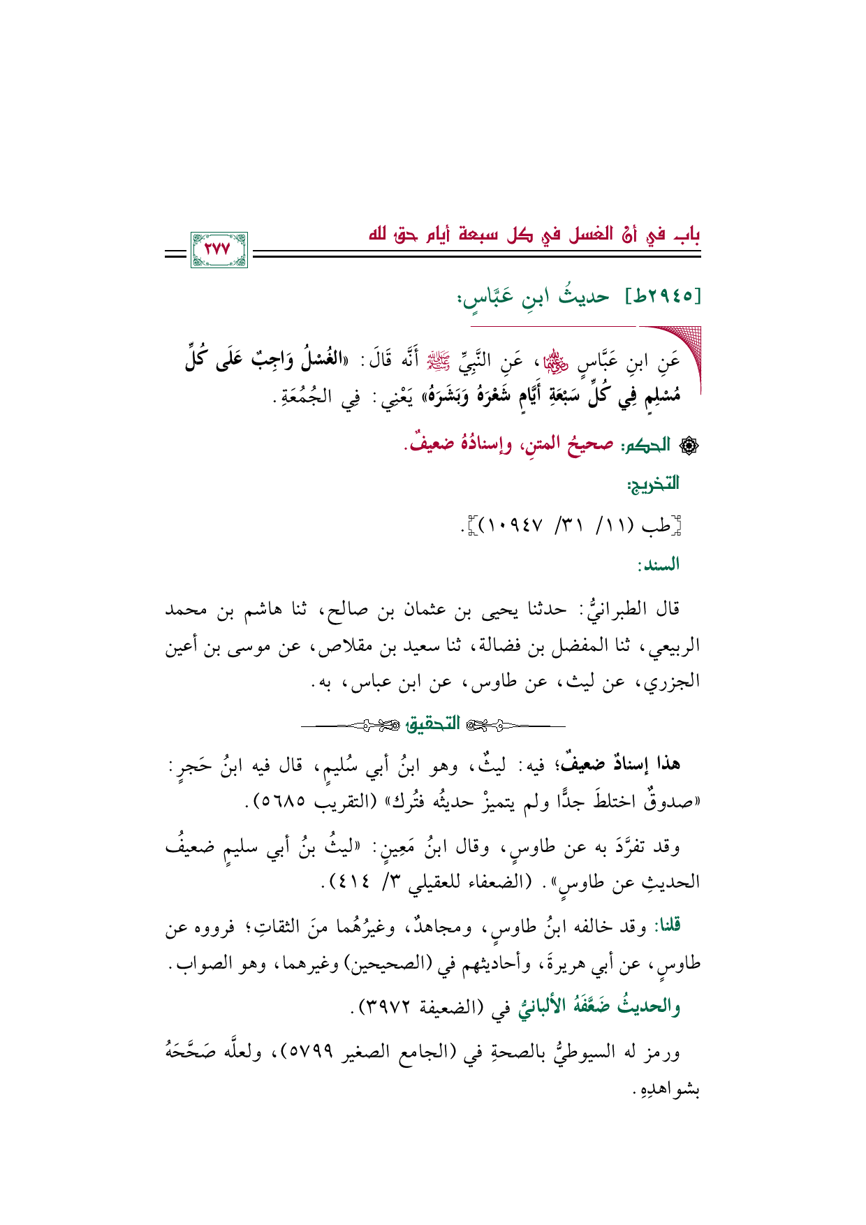 ◼ عَنِ ابنِ عَبَّاسٍ رضي الله عنهما، عَنِ النَّبِيِّ صلى الله عليه وسلم أَنَّه قَالَ: ((الغُسْلُ وَاجِبٌ عَلَى كُلِّ مُسْلِمٍ فِي كُلِّ سَبْعَةِ أَيَّامٍ شَعْرَهُ وَبَشَرَهُ)) يَعْنِي: فِي الجُمُعَةِ.