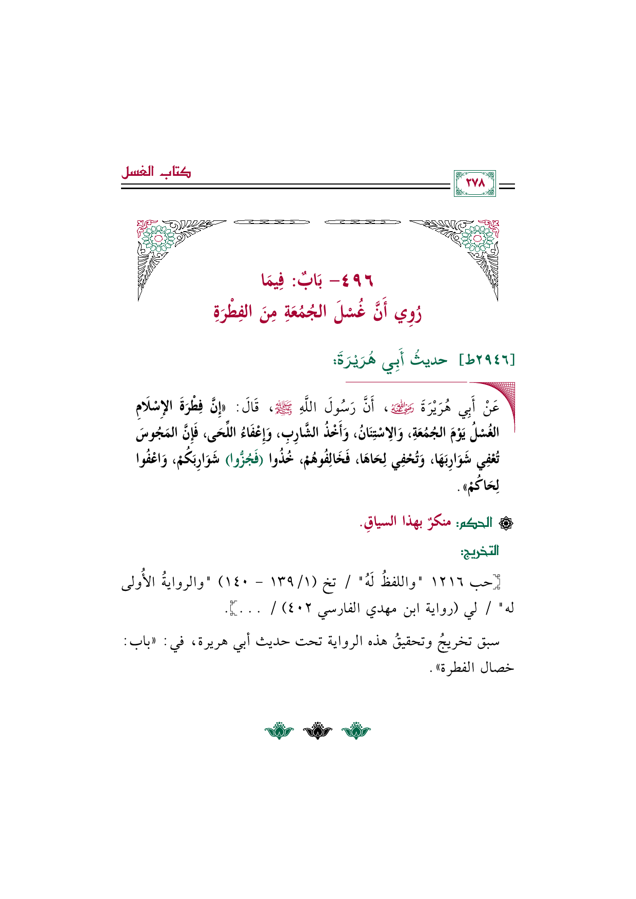 ◼ عَنْ أَبِي هُرَيْرَةَ رضي الله عنه، أَنَّ رَسُولَ اللَّهِ صلى الله عليه وسلم، قَالَ: ((إِنَّ فِطْرَةَ الإِسْلَامِ الغُسْلُ يَوْمَ الجُمُعَةِ، وَالِاسْتِنَانُ، وَأَخْذُ الشَّارِبِ، وَإِعْفَاءُ اللِّحَى، فَإِنَّ المَجُوسَ تُعْفِي شَوَارِبَهَا، وَتُحْفِي لِحَاهَا، فَخَالِفُوهُمْ، خُذُوا (فَجُزُّوا) شَوَارِبَكُمْ، وَاعْفُوا لِحَاكُمْ)).