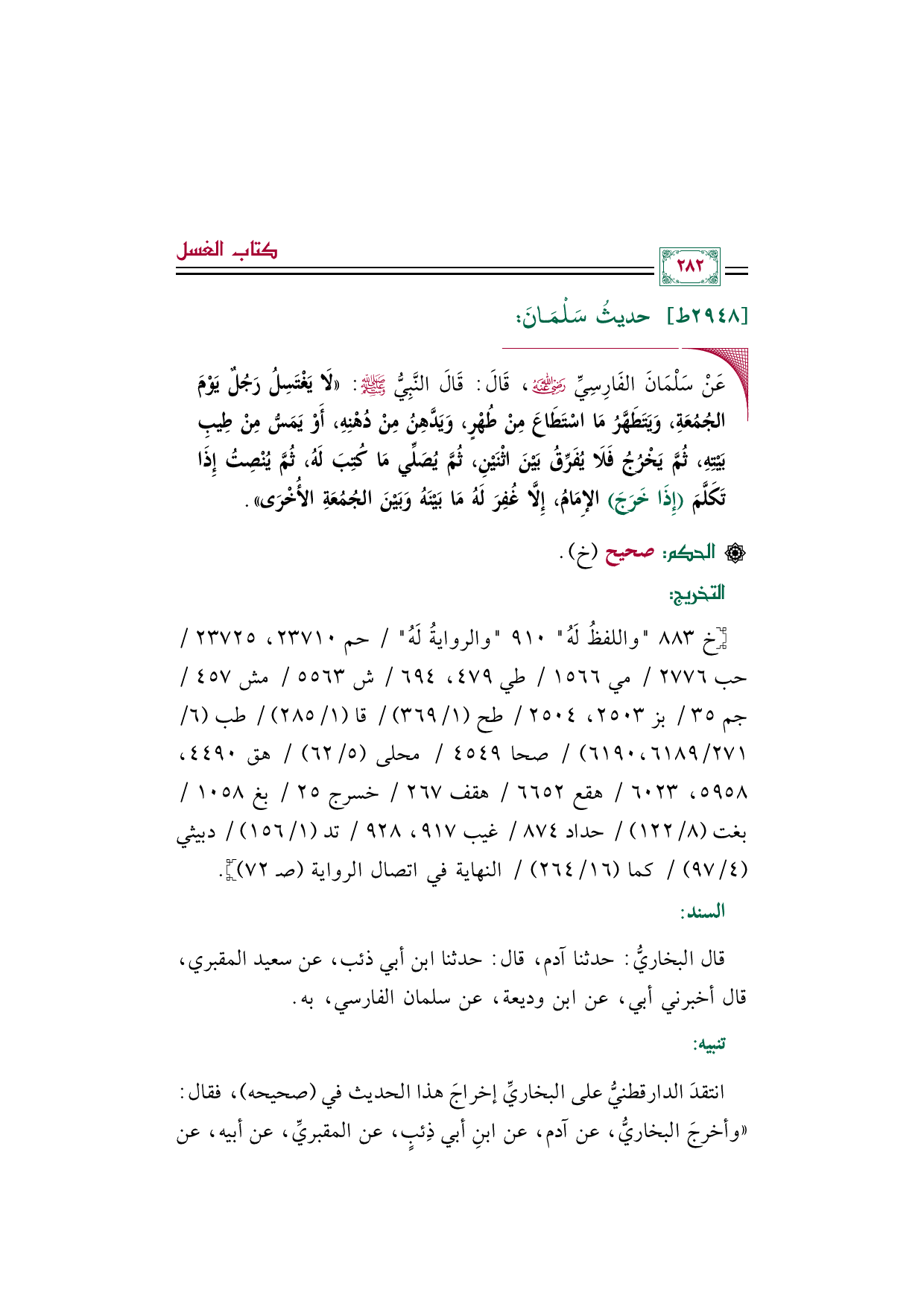 ◼ عَنْ سَلْمَانَ الفَارِسِيِّ رضي الله عنه، قَالَ: قَالَ النَّبِيُّ صلى الله عليه وسلم: ((لَا يَغْتَسِلُ رَجُلٌ يَوْمَ الجُمُعَةِ، وَيَتَطَهَّرُ مَا اسْتَطَاعَ مِنْ طُهْرٍ، وَيَدَّهِنُ مِنْ دُهْنِهِ، أَوْ يَمَسُّ مِنْ طِيبِ بَيْتِهِ، ثُمَّ يَخْرُجُ فَلَا يُفَرِّقُ بَيْنَ اثْنَيْنِ، ثُمَّ يُصَلِّي مَا كُتِبَ لَهُ، ثُمَّ يُنْصِتُ إِذَا تَكَلَّمَ (إِذَا خَرَجَ) الإِمَامُ، إِلَّا غُفِرَ لَهُ مَا بَيْنَهُ وَبَيْنَ الجُمُعَةِ الأُخْرَى)).