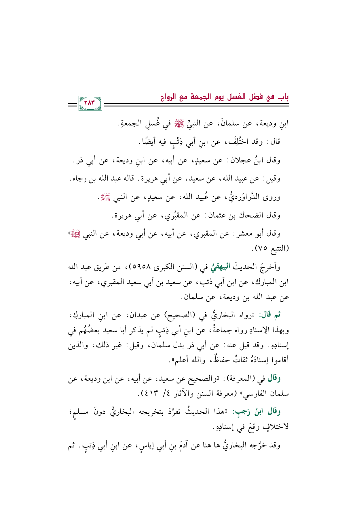 ثم قال: "رواه البخاريُّ في (الصحيح) عن عبدان، عن ابنِ المباركِ، وبهذا الإسنادِ رواه جماعةٌ، عن ابنِ أبي ذِئبٍ لم يذكر أبا سعيد بعضُهُم في إسنادِهِ. وقد قيل عنه: عن أبي ذر بدل سلمان، وقيل: غير ذلك، والذين أقاموا إسنادَهُ ثقاتٌ حفاظٌ، والله أعلم".