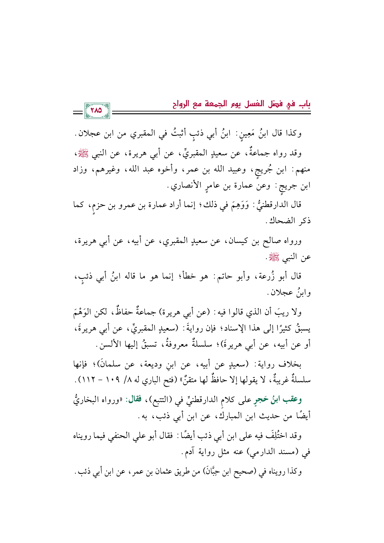 وعقب ابنُ حَجرٍ على كلامِ الدارقطنيِّ في (التتبع)، فقال: "ورواه البخاريُّ أيضًا من حديث ابن المبارك، عن ابن أبي ذئب، به.