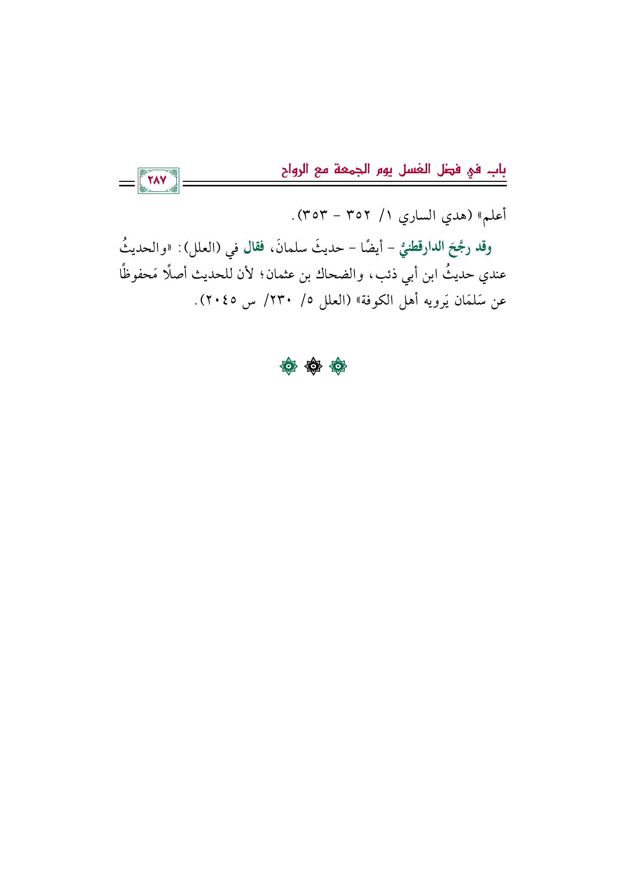 وقد رجَّحَ الدارقطنيُّ -أيضًا- حديثَ سلمانَ، فقال في (العلل): "والحديثُ عندي حديثُ ابن أبي ذئب، والضحاك بن عثمان؛ لأن للحديث أصلًا مَحفوظًا عن سَلمَان يَرويه أهل الكوفة" (العلل ٥/ ٢٣٠/ س ٢٠٤٥).