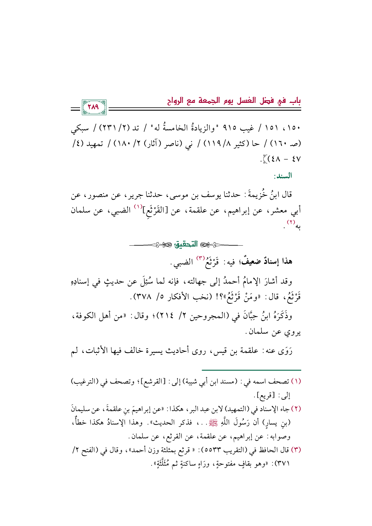 قال ابنُ خُزيمةَ: حدثنا يوسف بن موسى، حدثنا جرير، عن منصور، عن أبي معشر، عن إبراهيم، عن علقمة، عن [القَرْثَعِ] (¬١) الضبي، عن سلمان به (¬٢).