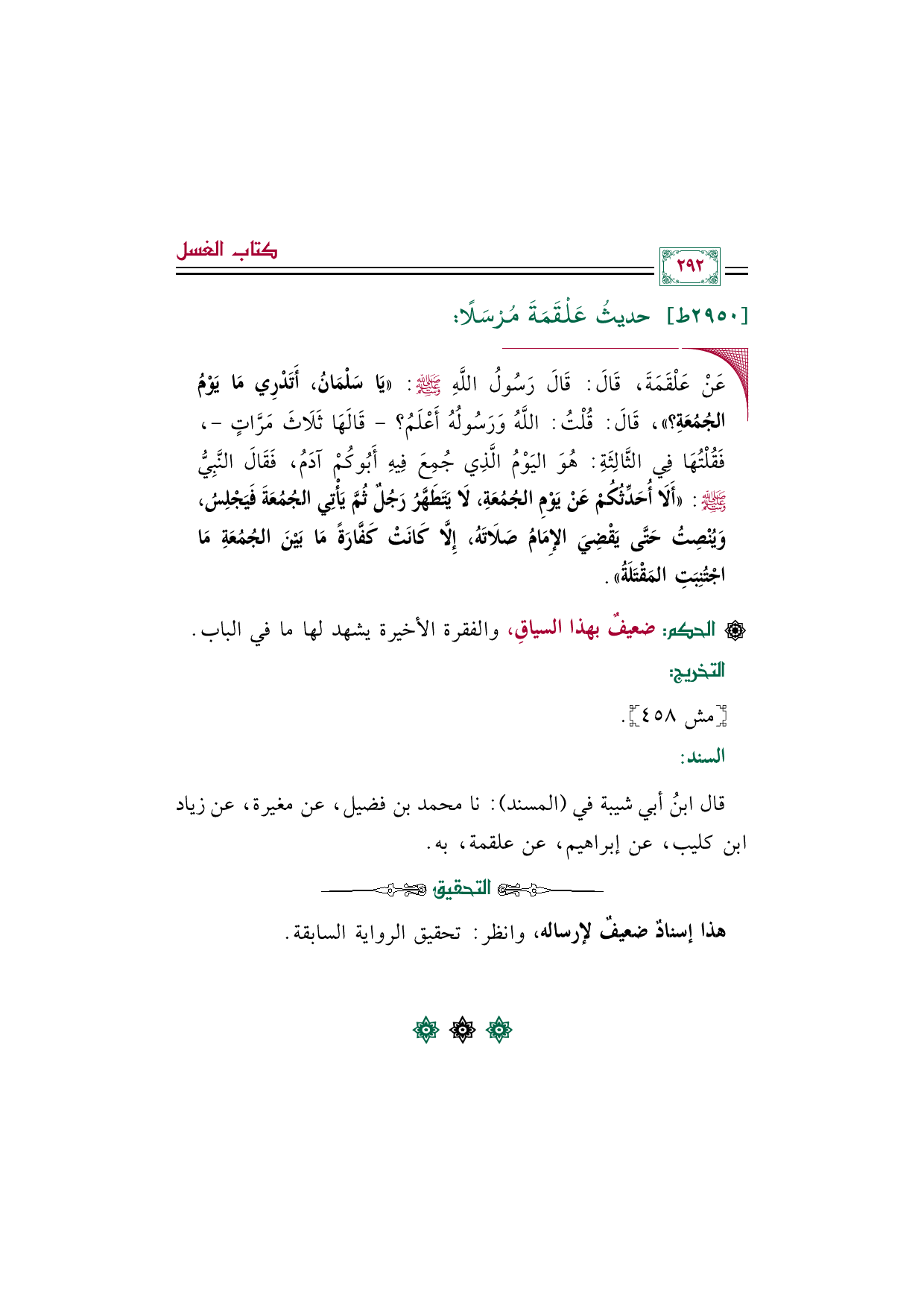 ◼ عَنْ عَلْقَمَةَ، قَالَ: قَالَ رَسُولُ اللَّهِ صلى الله عليه وسلم: ((يَا سَلْمَانُ، أَتَدْرِي مَا يَوْمُ الجُمُعَةِ؟ ))، قَالَ: قُلْتُ: اللَّهُ وَرَسُولُهُ أَعْلَمُ؟ -قَالَهَا ثَلَاثَ مَرَّاتٍ-، فَقُلْتُهَا فِي الثَّالِثَةِ: هُوَ اليَوْمُ الَّذِي جُمِعَ فِيهِ أَبُوكُمْ آدَمُ، فَقَالَ النَّبِيُّ صلى الله عليه وسلم: ((أَلَا أُحَدِّثُكُمْ عَنْ يَوْمِ الجُمُعَةِ، لَا يَتَطَهَّرُ رَجُلٌ ثُمَّ يَأْتِي الجُمُعَةَ فَيَجْلِسُ، وَيُنْصِتُ حَتَّى يَقْضِيَ الإِمَامُ صَلَاتَهُ، إِلَّا كَانَتْ كَفَّارَةً مَا بَيْنَ الجُمُعَةِ مَا اجْتُنِبَتِ المَقْتَلَةُ)).
