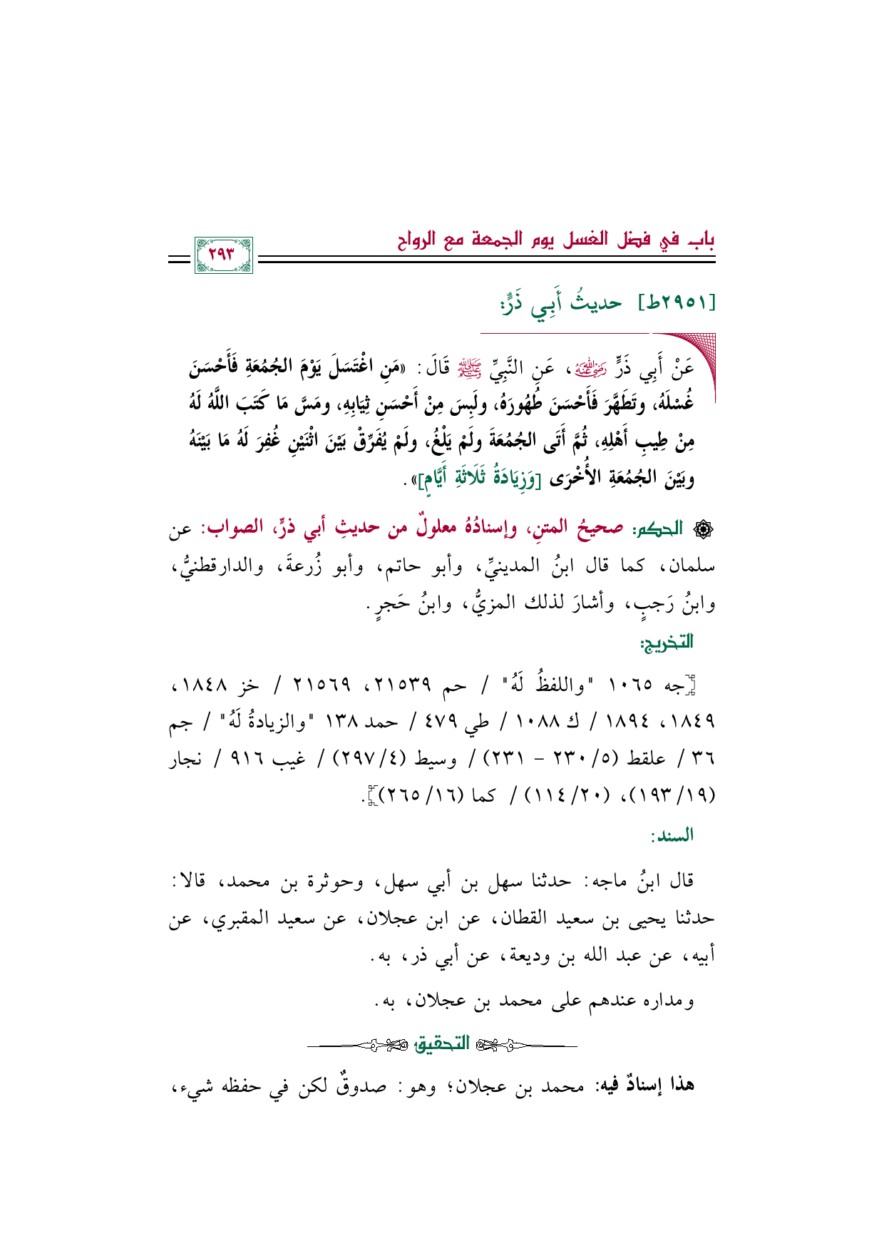 [الحكم]: صحيحُ المتنِ، وإسنادُهُ معلولٌ من حديثِ أبي ذرٍّ، الصواب: عن سلمان، كما قال ابنُ المدينيِّ، وأبو حاتم، وأبو زُرعةَ، والدارقطنيُّ، وابنُ رَجبٍ، وأشارَ لذلك المزيُّ، وابنُ حَجرٍ.