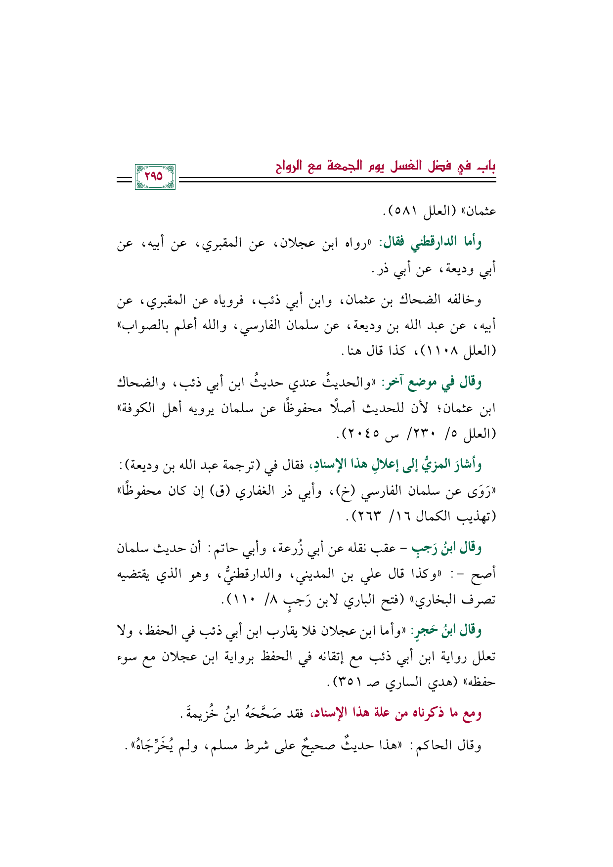 وقال ابنُ رَجبٍ -عقب نقله عن أبي زُرعة، وأبي حاتم: أن حديث سلمان أصح-: "وكذا قال علي بن المديني، والدارقطنيُّ، وهو الذي يقتضيه تصرف البخاري" (فتح الباري لابن رَجبٍ ٨/ ١١٠).
