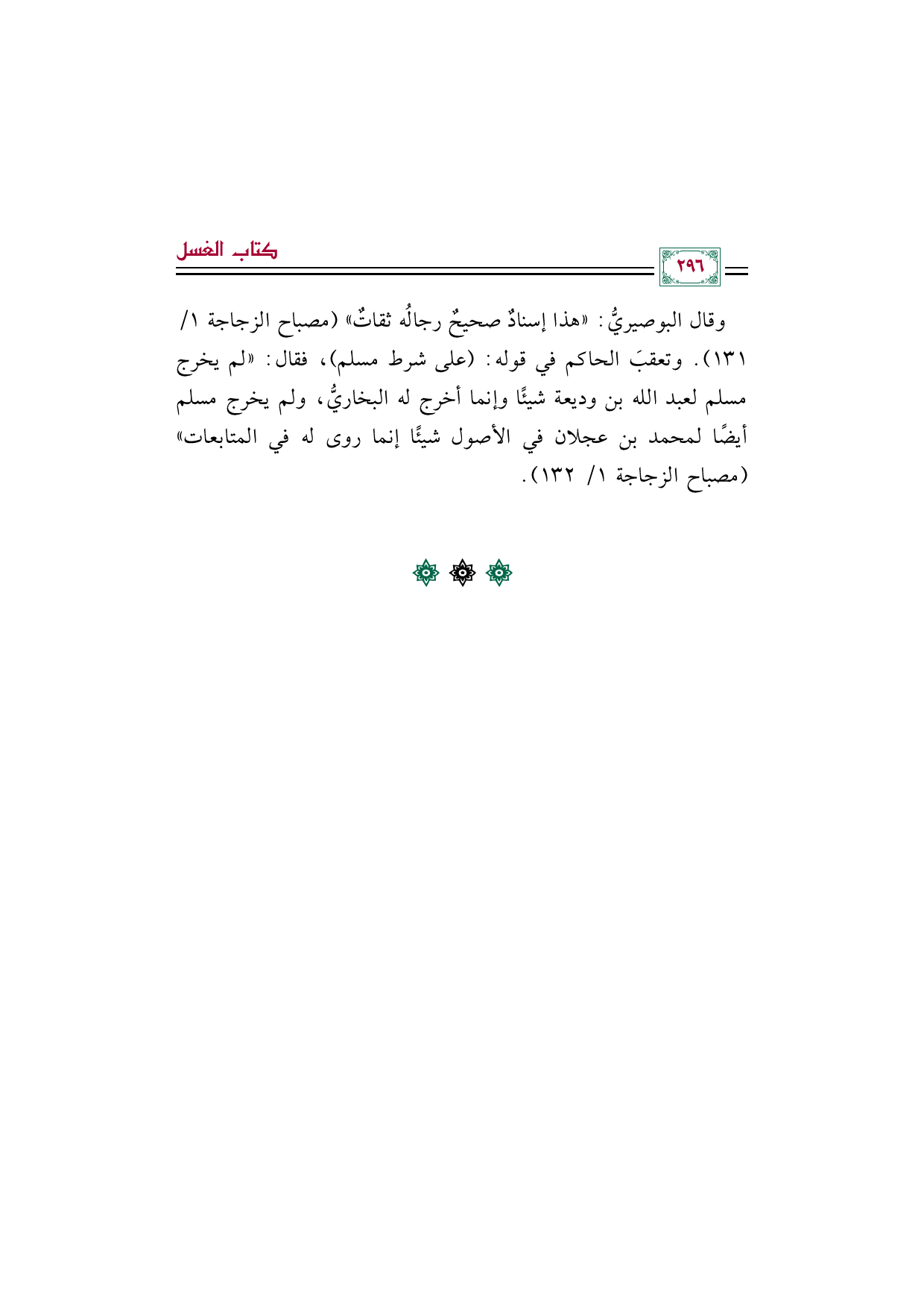 وقال البوصيريُّ: "هذا إسنادٌ صحيحٌ رجالُه ثقاتٌ" (مصباح الزجاجة ١/ ١٣١). وتعقبَ الحاكم في قوله: (على شرط مسلم)، فقال: "لم يخرج مسلم لعبد الله بن وديعة شيئًا وإنما أخرج له البخاريُّ، ولم يخرج مسلم أيضًا لمحمد بن عجلان في الأصول شيئًا إنما روى له في المتابعات" (مصباح الزجاجة ١/ ١٣٢).