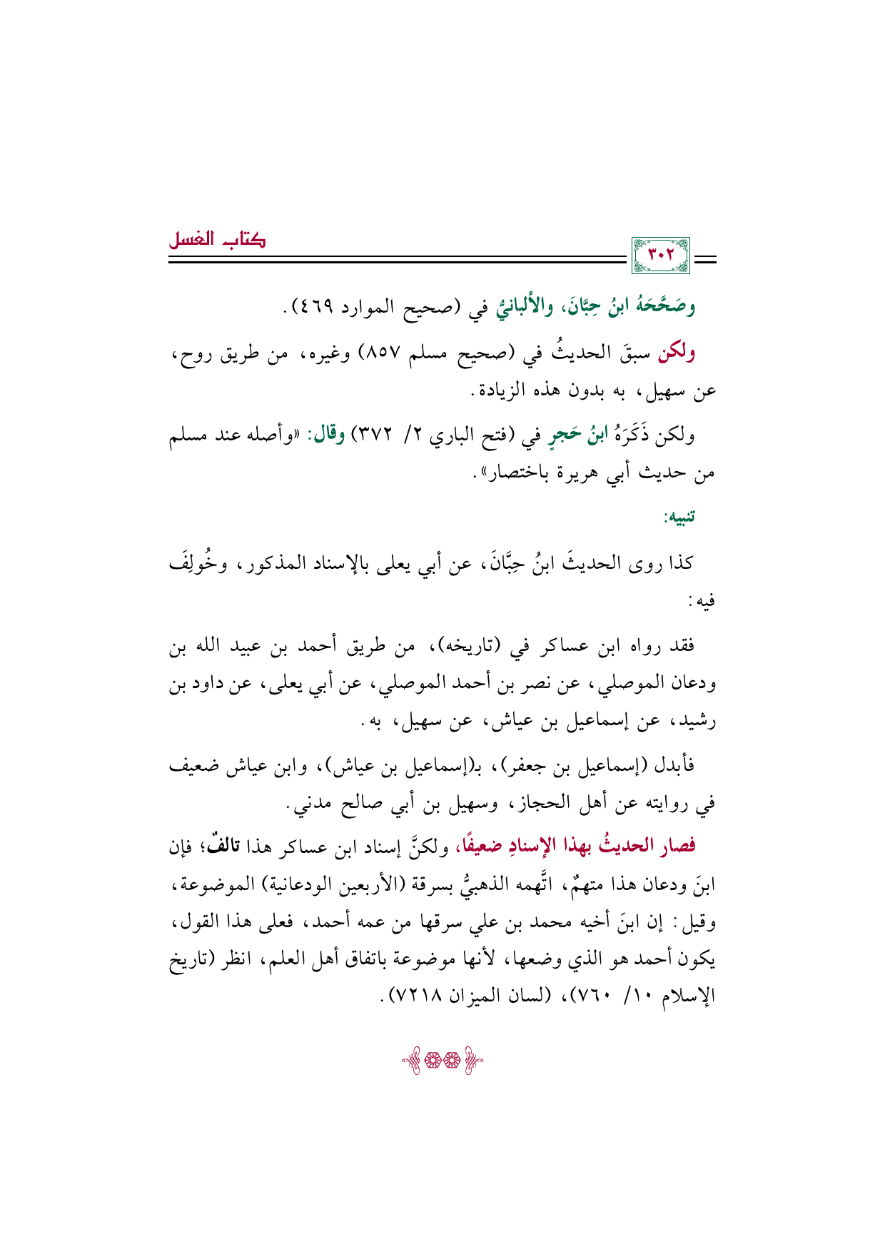 فصار الحديثُ بهذا الإسنادِ ضعيفًا، ولكنَّ إسناد ابن عساكر هذا تالفٌ؛ فإن ابنَ ودعان هذا متهمٌ، اتَّهمه الذهبيُّ بسرقة (الأربعين الودعانية) الموضوعة، وقيل: إن ابنَ أخيه محمد بن علي سرقها من عمه أحمد، فعلى هذا القول، يكون أحمد هو الذي وضعها، لأنها موضوعة باتفاق أهل العلم، انظر (تاريخ الإسلام ١٠/ ٧٦٠)، (لسان الميزان ٧٢١٨).
