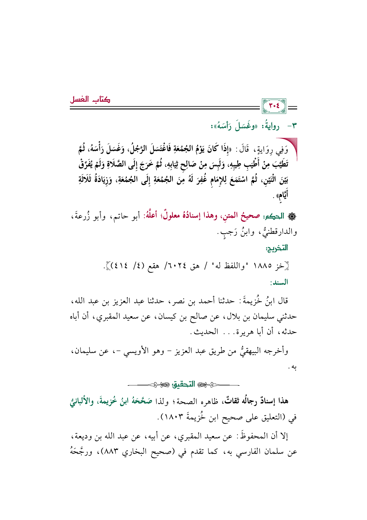 قال ابنُ خُزيمةَ: حدثنا أحمد بن نصر، حدثنا عبد العزيز بن عبد الله، حدثني سليمان بن بلال، عن صالح بن كيسان، عن سعيد المقبري، أن أباه حدثه، أن أبا هريرة ... الحديث.