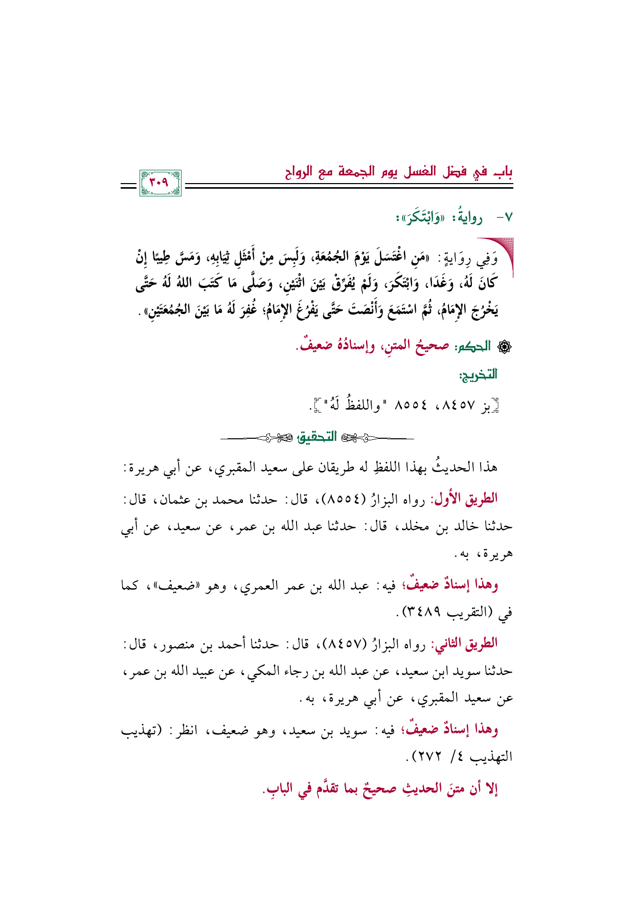 رواه البزارُ (٨٥٥٤)، قال: حدثنا محمد بن عثمان، قال: حدثنا خالد بن مخلد، قال: حدثنا عبد الله بن عمر، عن سعيد، عن أبي هريرة، به.