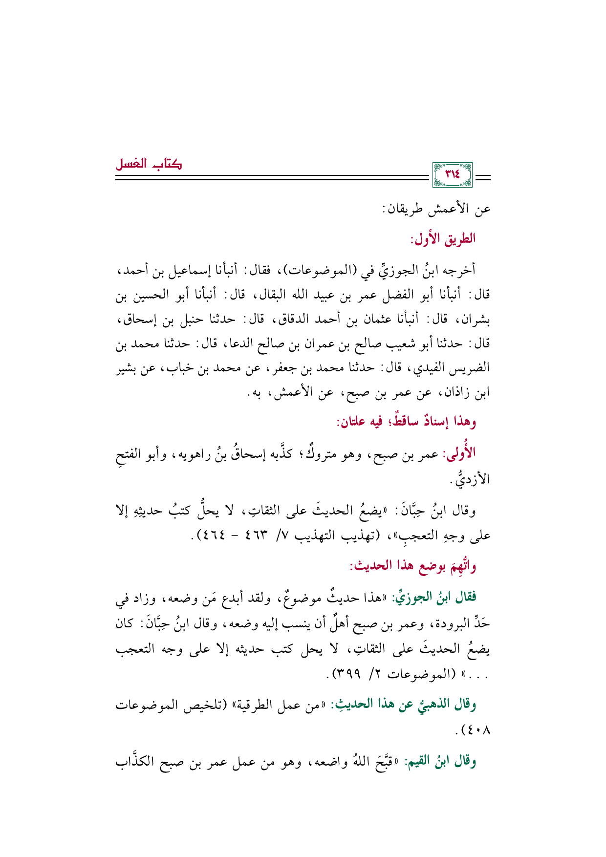 فقال ابنُ الجوزيِّ: "هذا حديثٌ موضوعٌ، ولقد أبدع مَن وضعه، وزاد في حَدِّ البرودة، وعمر بن صبح أهلٌ أن ينسب إليه وضعه، وقال ابنُ حِبَّانَ: كان يضعُ الحديثَ على الثقاتِ، لا يحل كتب حديثه إلا على وجه التعجب ... " (الموضوعات ٢/ ٣٩٩).