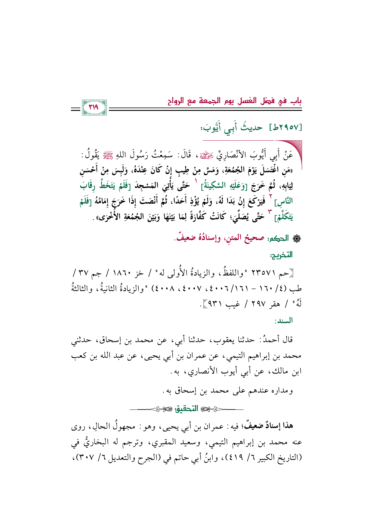 قال أحمدُ: حدثنا يعقوب، حدثنا أبي، عن محمد بن إسحاق، حدثني محمد بن إبراهيم التيمي، عن عمران بن أبي يحيى، عن عبد الله بن كعب بن مالك، عن أبي أيوب الأنصاري، به.