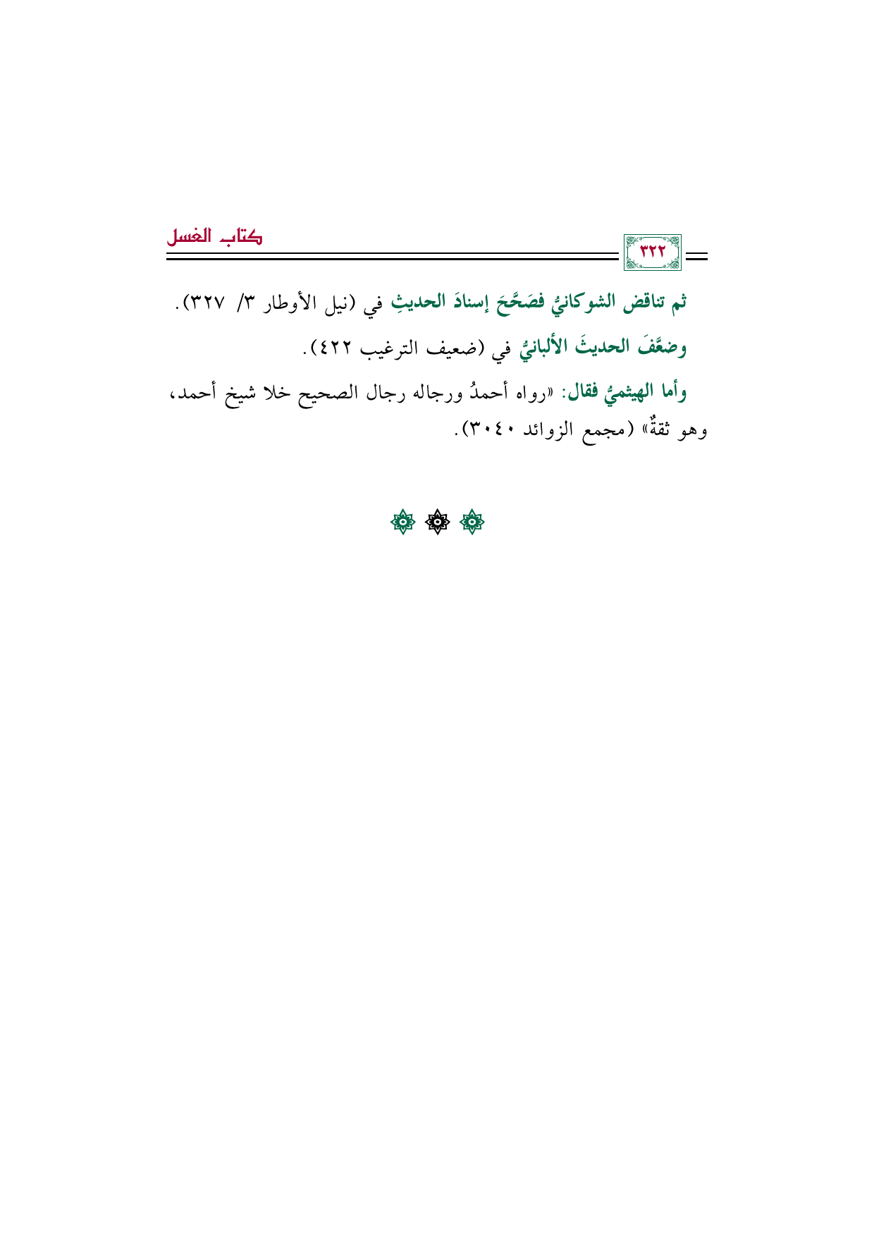 ثم تناقض الشوكانيُّ فصَحَّحَ إسنادَ الحديثِ في (نيل الأوطار ٣/ ٣٢٧).