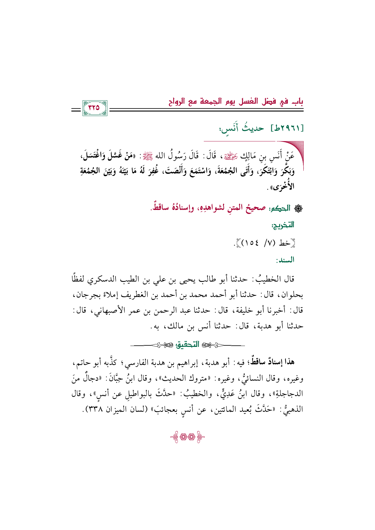 هذا إسنادٌ ساقطٌ؛ فيه: أبو هدبة، إبراهيم بن هدبة الفارسي؛ كذَّبه أبو حاتم، وغيره، وقال النسائيُّ، وغيره: "متروك الحديث"، وقال ابنُ حِبَّانَ: "دجالٌ منَ الدجاجلةِ"، وقال ابنُ عَدِيٍّ، والخطيبُ: "حدَّثَ بالبواطيلِ عن أنسٍ"، وقال الذهبيُّ: "حَدَّثَ بُعيد المائتين، عن أنسٍ بعجائبَ" (لسان الميزان ٣٣٨).