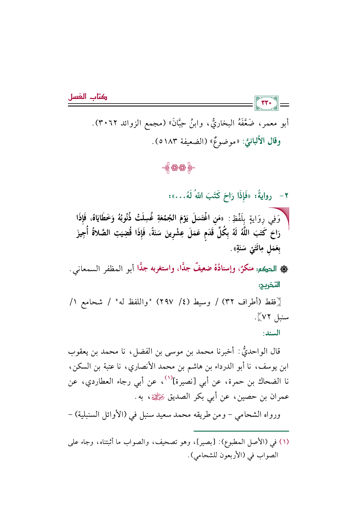 قال الواحديُّ: أخبرنا محمد بن موسى بن الفضل، نا محمد بن يعقوب بن يوسف، نا أبو الدرداء بن هاشم بن محمد الأنصاري، نا عتبة بن السكن، نا الضحاك بن حمرة، عن أبي [نصيرة] (¬١)، عن أبي رجاء العطاردي، عن عمران بن حصين، عن أبي بكر الصديق رضي الله عنه، به.