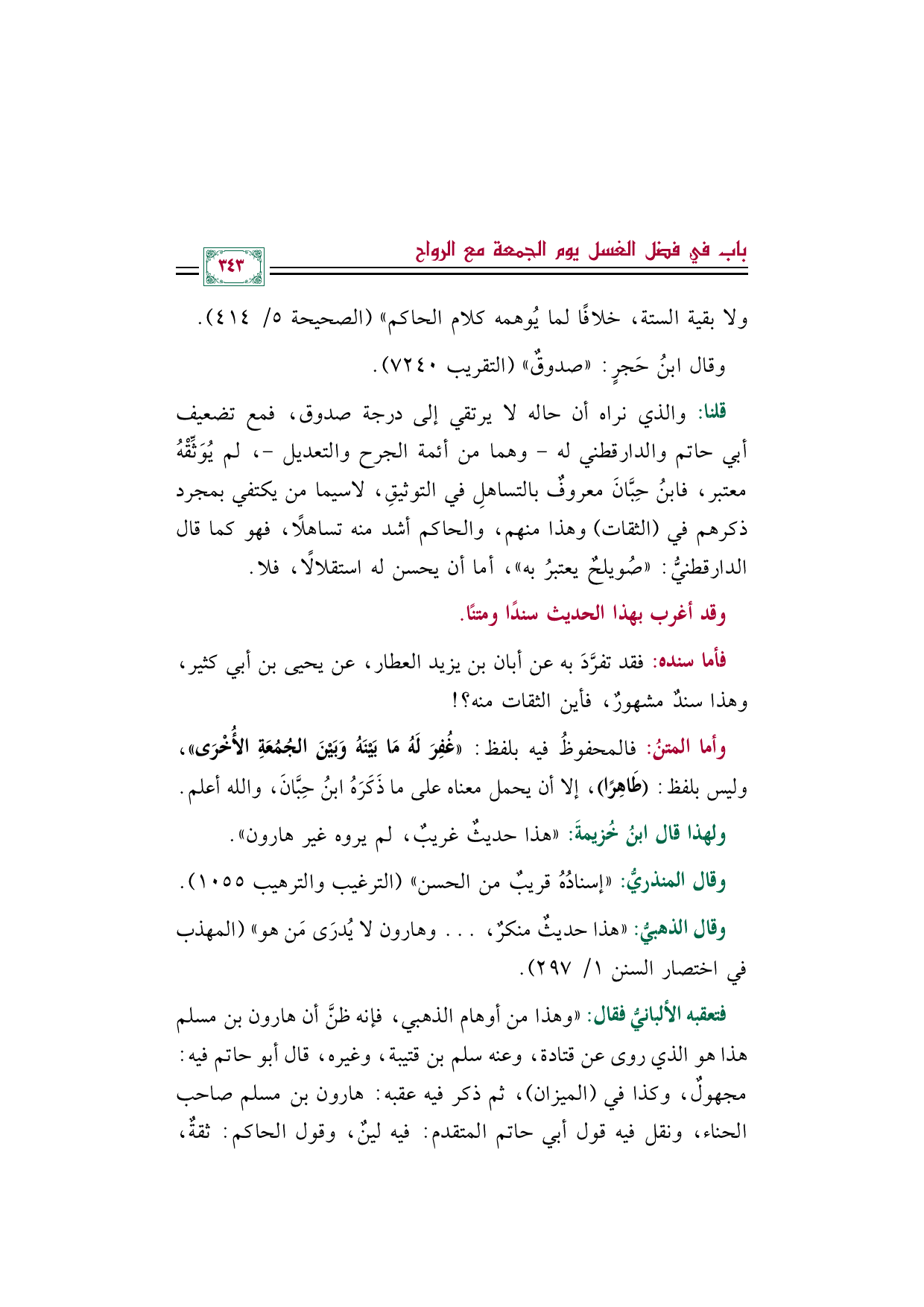 وأما المتنُ: فالمحفوظُ فيه بلفظ: ((غُفِرَ لَهُ مَا بَيْنَهُ وَبَيْنَ الجُمُعَةِ الأُخْرَى))، وليس بلفظ: (طَاهِرًا)، إلا أن يحمل معناه على ما ذَكَرَهُ ابنُ حِبَّانَ، والله أعلم.