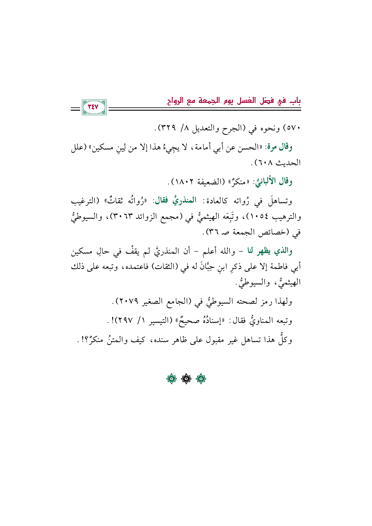 وتساهلَ في رُواته كالعادة: المنذريُّ فقال: "رُواتُه ثقاتٌ" (الترغيب والترهيب ١٠٥٤)، وتَبِعَه الهيثميُّ في (مجمع الزوائد ٣٠٦٣)، والسيوطيُّ في (خصائص الجمعة صـ ٣٦).