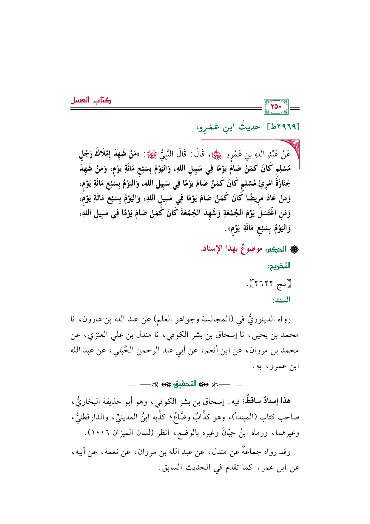 رواه الدينوريُّ في (المجالسة وجواهر العلم) عن عبد الله بن هارون، نا محمد بن يحيى، نا إسحاق بن بشر الكوفي، نا مندل بن علي العنزي، عن محمد بن مروان، عن ابن أنعم، عن أبي عبد الرحمن الحُبَلي، عن عبد الله بن عمرو، به.