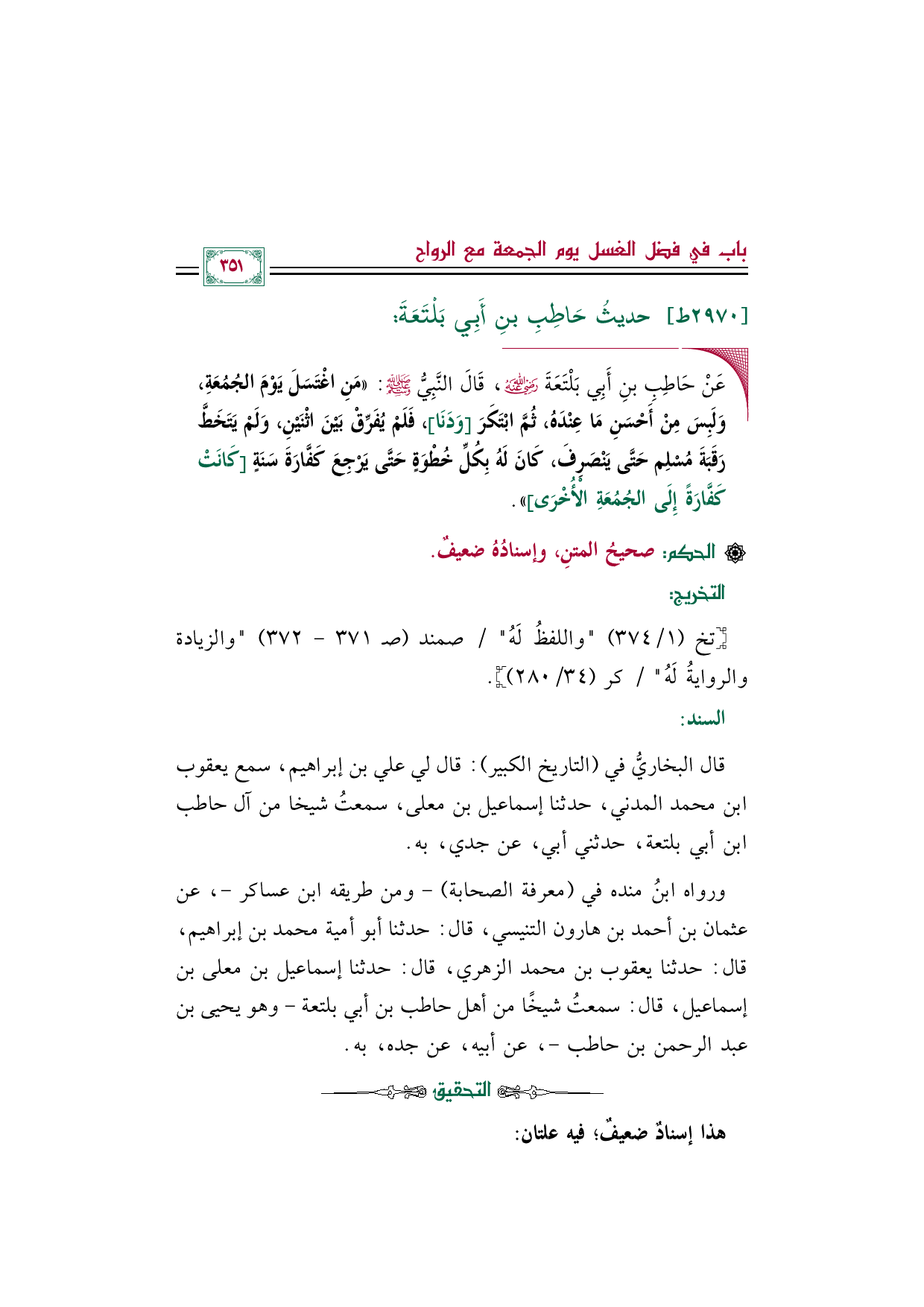 قال البخاريُّ في (التاريخ الكبير): قال لي علي بن إبراهيم، سمع يعقوب بن محمد المدني، حدثنا إسماعيل بن معلى، سمعتُ شيخا من آل حاطب بن أبي بلتعة، حدثني أبي، عن جدي، به.
