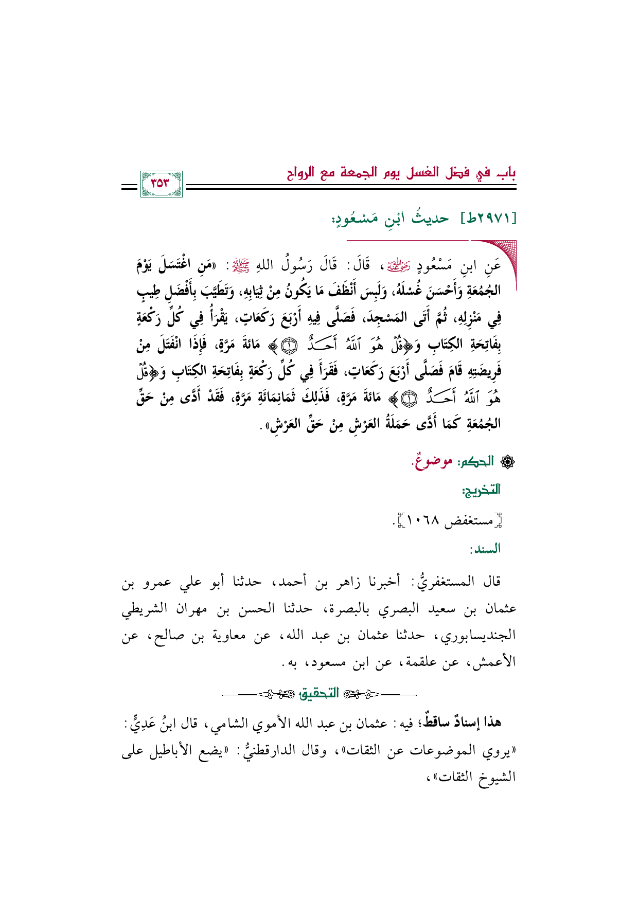 قال المستغفريُّ: أخبرنا زاهر بن أحمد، حدثنا أبو علي عمرو بن عثمان بن سعيد البصري بالبصرة، حدثنا الحسن بن مهران الشريطي الجنديسابوري، حدثنا عثمان بن عبد الله، عن معاوية بن صالح، عن الأعمش، عن علقمة، عن ابن مسعود، به.