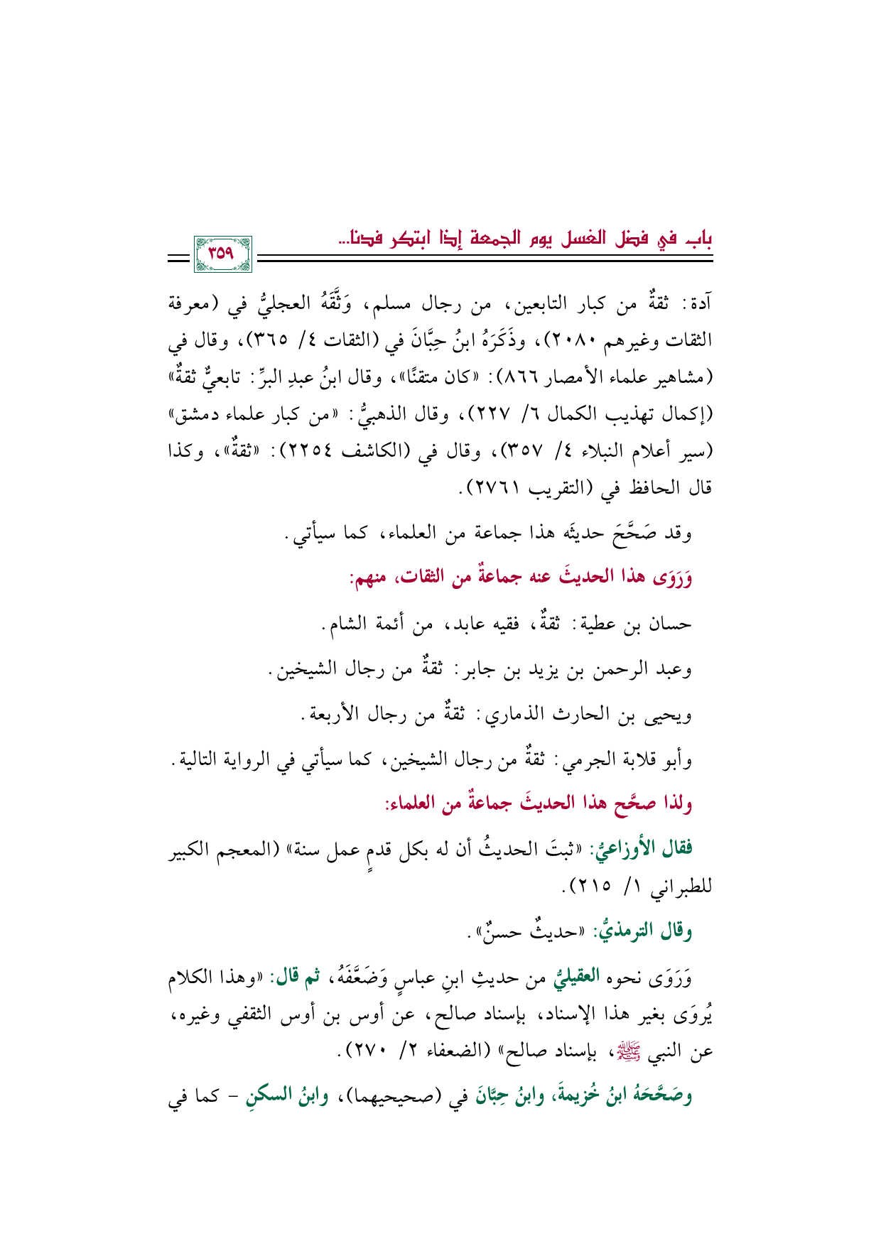 آدة: ثقةٌ من كبار التابعين، من رجال مسلم، وَثَّقَهُ العجليُّ في (معرفة الثقات وغيرهم ٢٠٨٠)، وذَكَرَهُ ابنُ حِبَّانَ في (الثقات ٤/ ٣٦٥)، وقال في (مشاهير علماء الأمصار ٨٦٦): "كان متقنًا"، وقال ابنُ عبدِ البرِّ: تابعيٌّ ثقةٌ" (إكمال تهذيب الكمال ٦/ ٢٢٧)، وقال الذهبيُّ: "من كبار علماء دمشق" (سير أعلام النبلاء ٤/ ٣٥٧)، وقال في (الكاشف ٢٢٥٤): "ثقةٌ"، وكذا قال الحافظ في (التقريب ٢٧٦١).