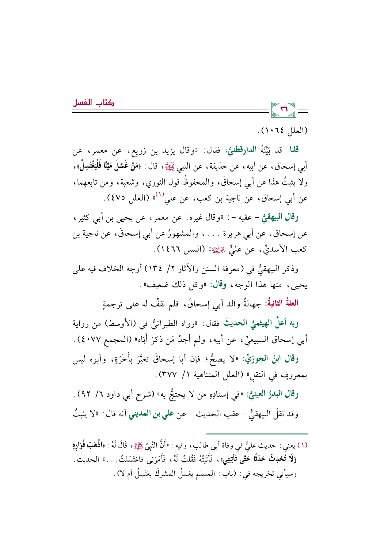 قلنا: قد بَيَّنَهُ الدارقطنيُّ، فقال: "وقال يزيد بن زريع، عن معمر، عن أبي إسحاق، عن أبيه، عن حذيفة، عن النبي صلى الله عليه وسلم، قال: ((مَنْ غَسَّلَ مَيِّتًا فَلْيَغْتَسِلْ))، ولا يثبتُ هذا عن أبي إسحاقَ، والمحفوظُ قول الثوري، وشعبة، ومن تابعهما، عن أبي إسحاق، عن ناجية بن كعب، عن علي (¬١) " (العلل ٤٧٥).
