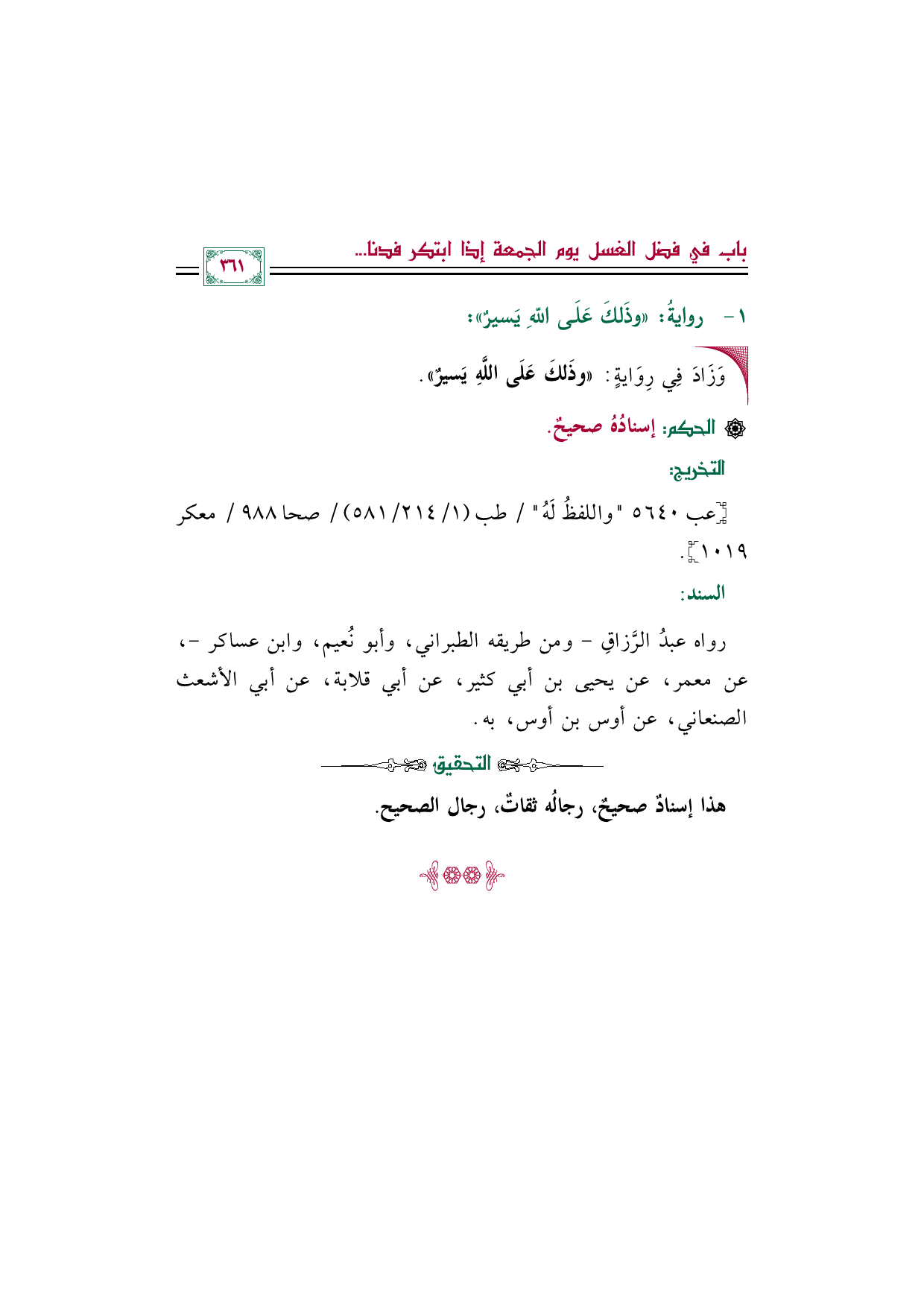 رواه عبدُ الرَّزاقِ -ومن طريقه الطبراني، وأبو نُعيم، وابن عساكر-، عن معمر، عن يحيى بن أبي كثير، عن أبي قلابة، عن أبي الأشعث الصنعاني، عن أوس بن أوس، به.