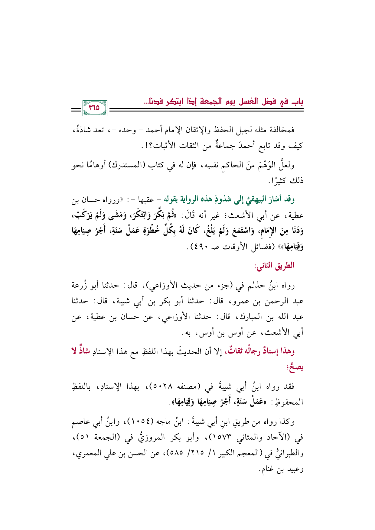 وقد أشارَ البيهقيُّ إلى شذوذِ هذه الرواية بقوله -عقبها-: "ورواه حسان بن عطية، عن أبي الأشعث؛ غير أنه قَالَ: ((ثُمَّ بَكَّرَ وَابْتَكَرَ، وَمَشَى وَلَمْ يَرْكَبْ، وَدَنَا مِنَ الإِمَامِ، وَاسْتَمَعَ وَلَمْ يَلْغُ، كَانَ لَهُ بِكُلِّ خُطْوَةٍ عَمَلُ سَنَةٍ، أَجْرُ صِيَامِهَا وَقِيَامِهَا)) " (فضائل الأوقات صـ ٤٩٠).
