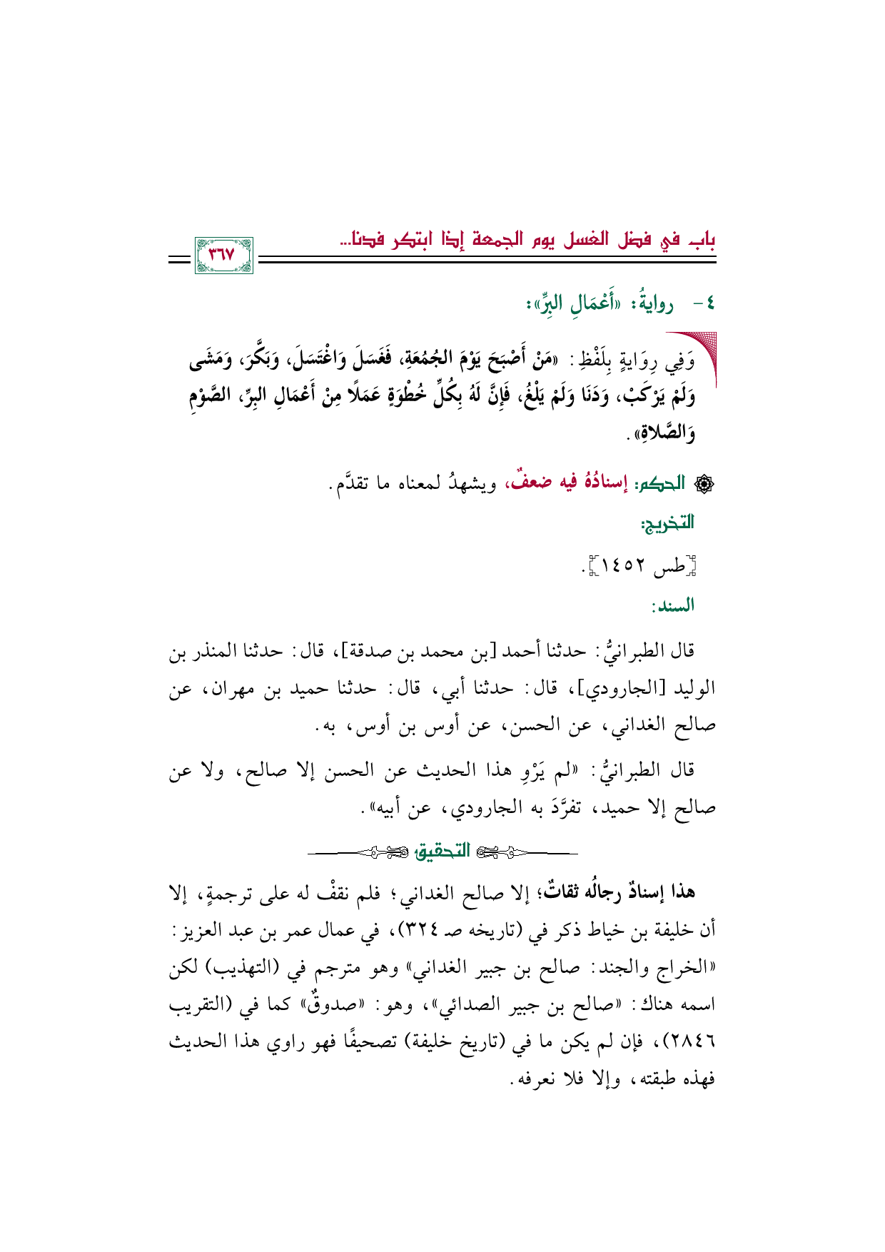قال الطبرانيُّ: حدثنا أحمد [بن محمد بن صدقة]، قال: حدثنا المنذر بن الوليد [الجارودي]، قال: حدثنا أبي، قال: حدثنا حميد بن مهران، عن صالح الغداني، عن الحسن، عن أوس بن أوس، به.