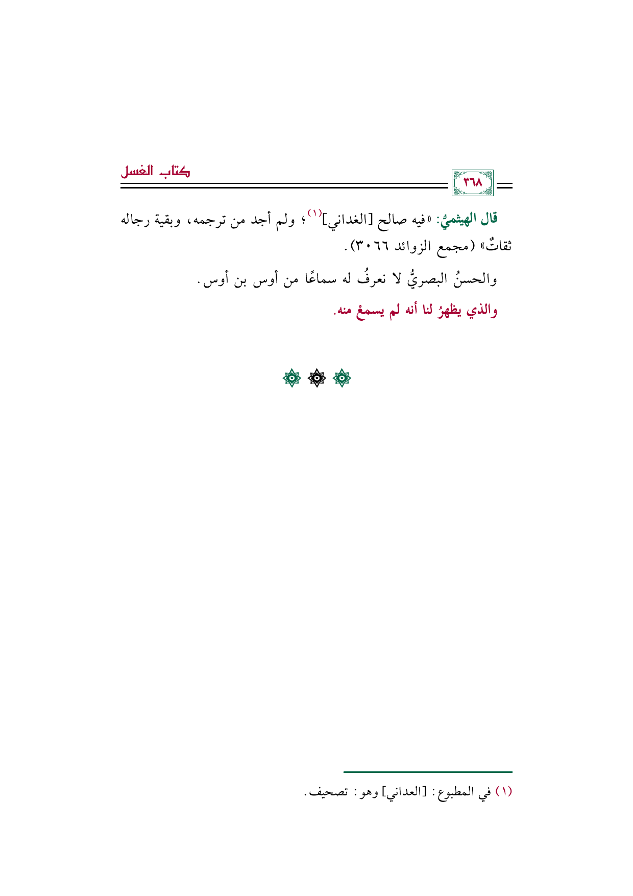 قال الهيثميُّ: "فيه صالح [الغداني] (¬١)؛ ولم أجد من ترجمه، وبقية رجاله ثقاتٌ" (مجمع الزوائد ٣٠٦٦).