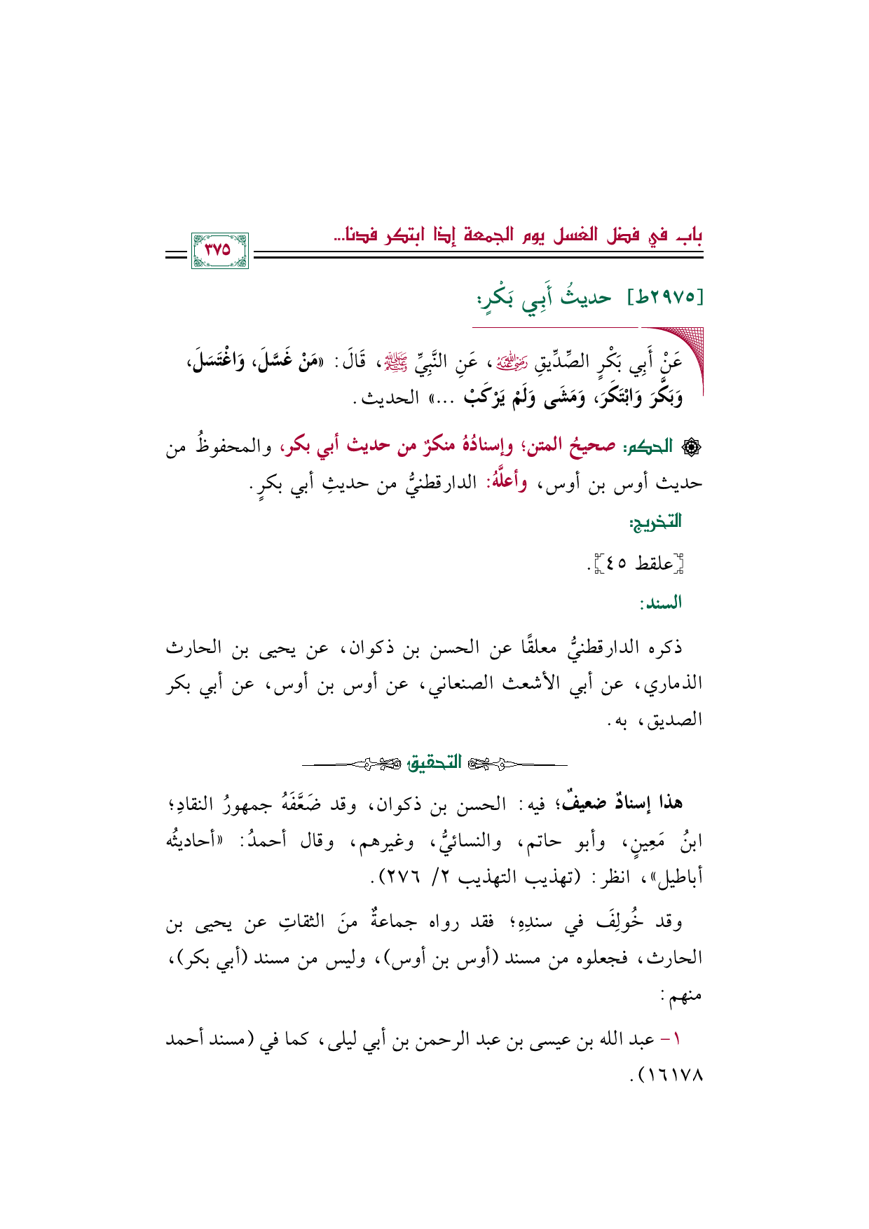 ذكره الدارقطنيُّ معلقًا عن الحسن بن ذكوان، عن يحيى بن الحارث الذماري، عن أبي الأشعث الصنعاني، عن أوس بن أوس، عن أبي بكر الصديق، به.