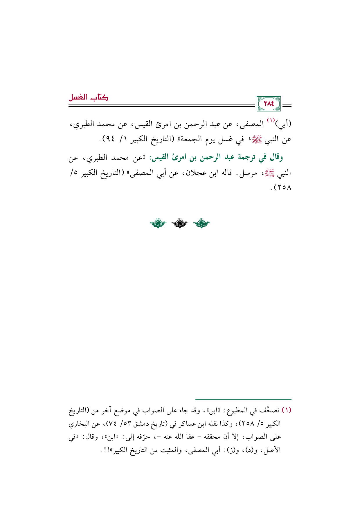 (أبي) (¬١) المصفى، عن عبد الرحمن بن امرئ القيس، عن محمد الطبري، عن النبي صلى الله عليه وسلم؛ في غسل يوم الجمعة" (التاريخ الكبير ١/ ٩٤).