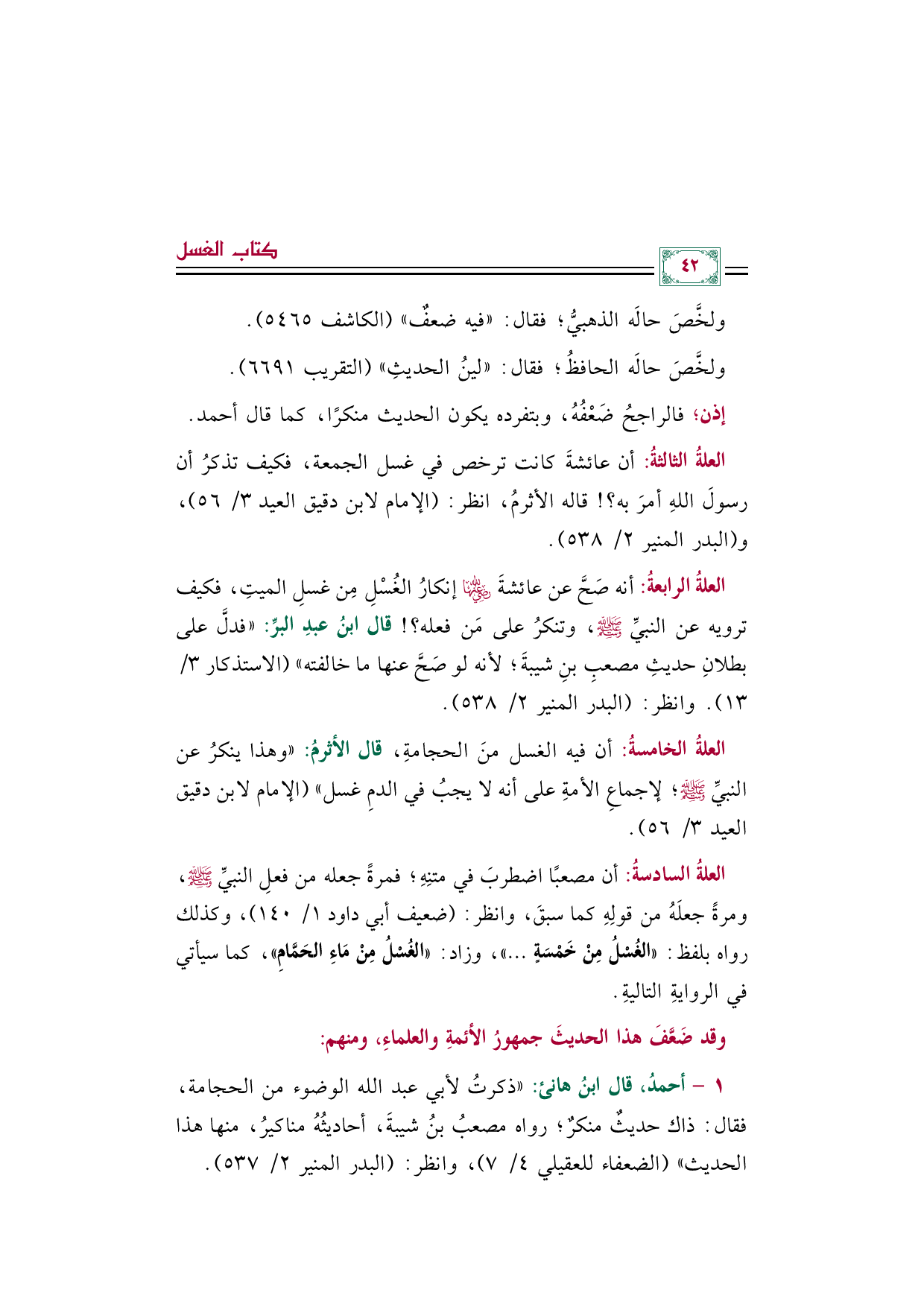 العلةُ الخامسةُ: أن فيه الغسل منَ الحجامةِ، قال الأثرمُ: "وهذا ينكرُ عن النبيِّ صلى الله عليه وسلم؛ لإجماعِ الأمةِ على أنه لا يجبُ في الدمِ غسل" (الإمام لابن دقيق العيد ٣/ ٥٦).