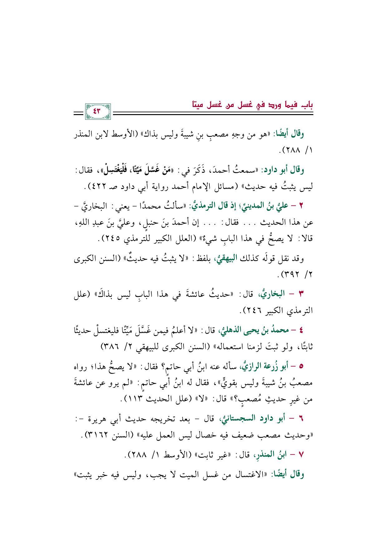 وقال أبو داود: "سمعتُ أحمدَ، ذَكَرَ في: ((مَنْ غَسَّلَ مَيِّتًا، فَلْيَغْتَسِلْ))، فقال: ليس يثبتُ فيه حديث" (مسائل الإمام أحمد رواية أبي داود صـ ٤٢٢).