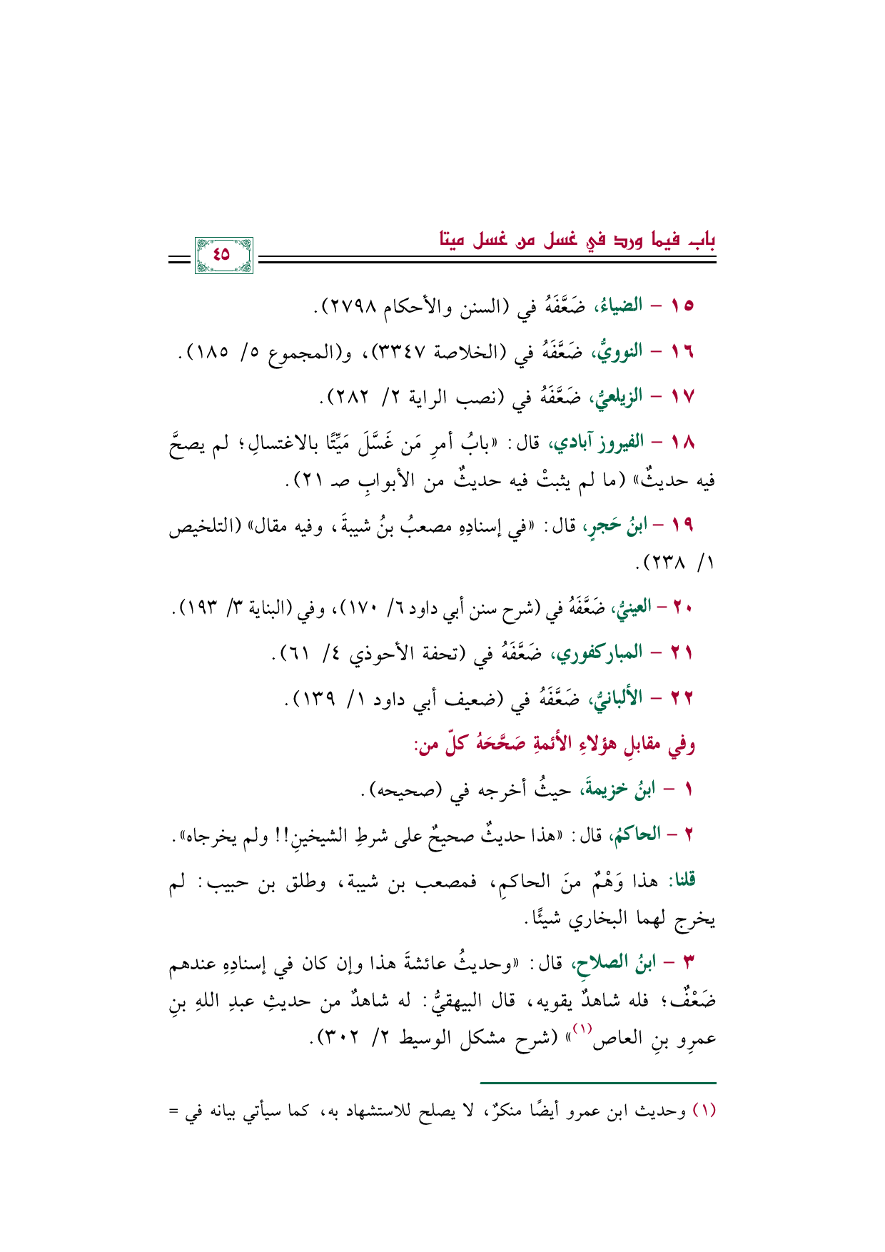 ١٨ - ابنُ حَجرٍ، قال: "في إسنادِهِ مصعبُ بنُ شيبةَ، وفيه مقال" (التلخيص ١/ ٢٣٨).