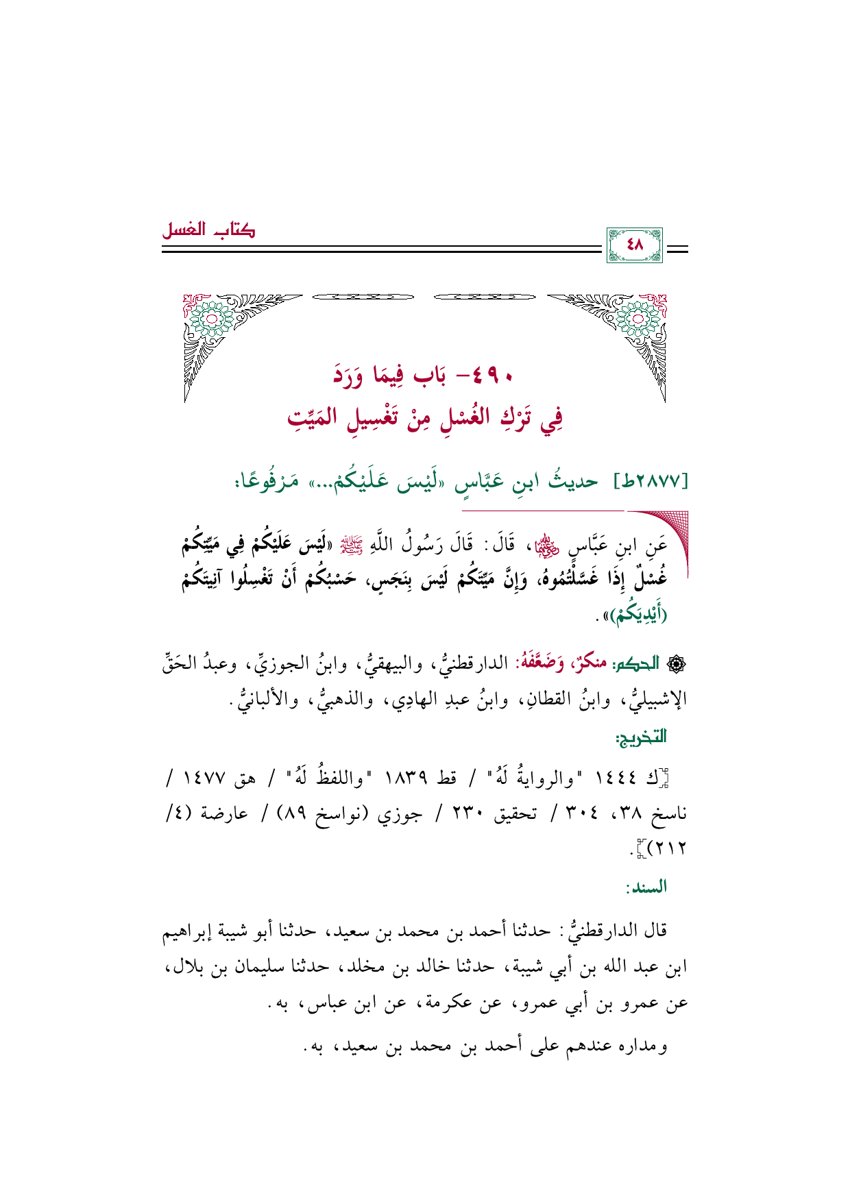 ◼ عَنِ ابنِ عَبَّاسٍ رضي الله عنهما، قَالَ: قَالَ رَسُولُ اللَّهِ صلى الله عليه وسلم ((لَيْسَ عَلَيْكُمْ فِي مَيِّتِكُمْ غُسْلٌ إِذَا غَسَّلْتُمُوهُ، وَإِنَّ مَيِّتَكُمْ لَيْسَ بِنَجَسٍ، حَسْبُكُمْ أَنْ تَغْسِلُوا آنِيتَكُمْ (أَيْدِيَكُمْ))).