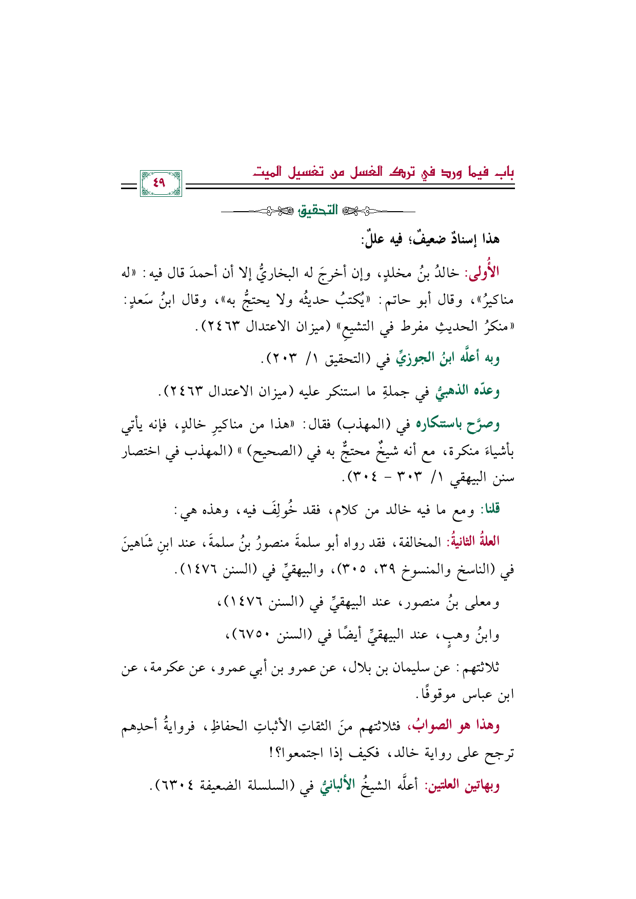وصرَّح باستنكاره في (المهذب) فقال: "هذا من مناكيرِ خالدٍ، فإنه يأتي بأشياءَ منكرة، مع أنه شيخٌ محتجٌّ به في (الصحيح) " (المهذب في اختصار سنن البيهقي ١/ ٣٠٣ - ٣٠٤).