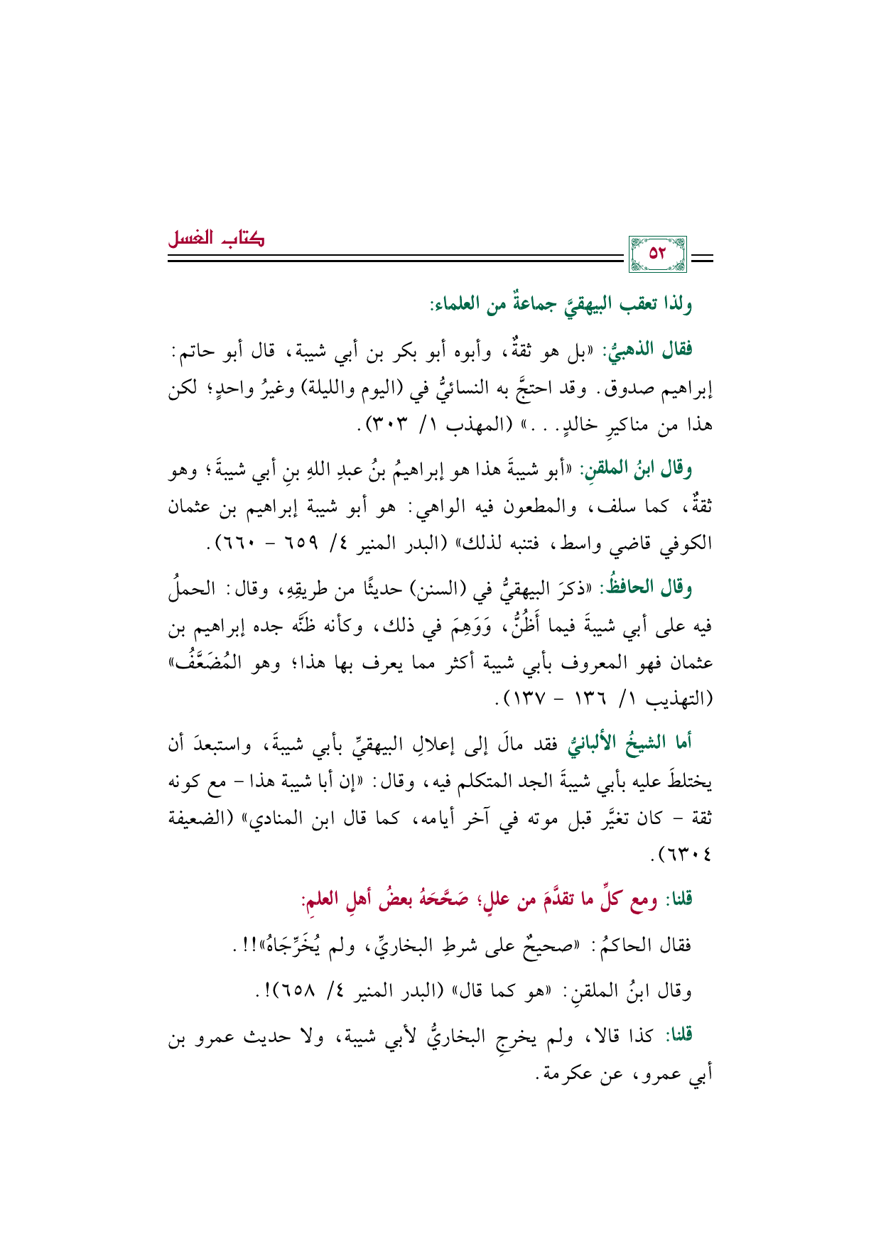 وقال الحافظُ: "ذكرَ البيهقيُّ في (السنن) حديثًا من طريقِهِ، وقال: الحملُ فيه على أبي شيبةَ فيما أَظُنُّ، وَوَهِمَ في ذلك، وكأنه ظَنَّه جده إبراهيم بن عثمان فهو المعروف بأبي شيبة أكثر مما يعرف بها هذا؛ وهو المُضَعَّفُ" (التهذيب ١/ ١٣٦ - ١٣٧).