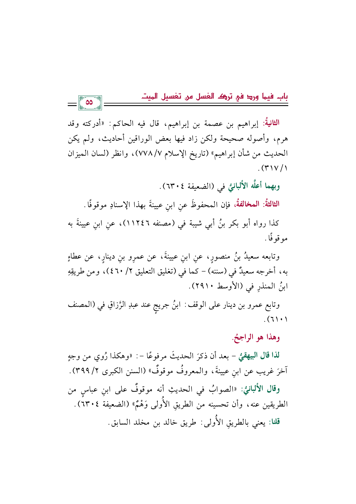 لذا قال البيهقيُّ -بعد أن ذكرَ الحديثَ مرفوعًا-: "وهكذا رُوي من وجهٍ آخرَ غريب عن ابنِ عيينةَ، والمعروفُ موقوفٌ" (السنن الكبرى ٢/ ٣٩٩).