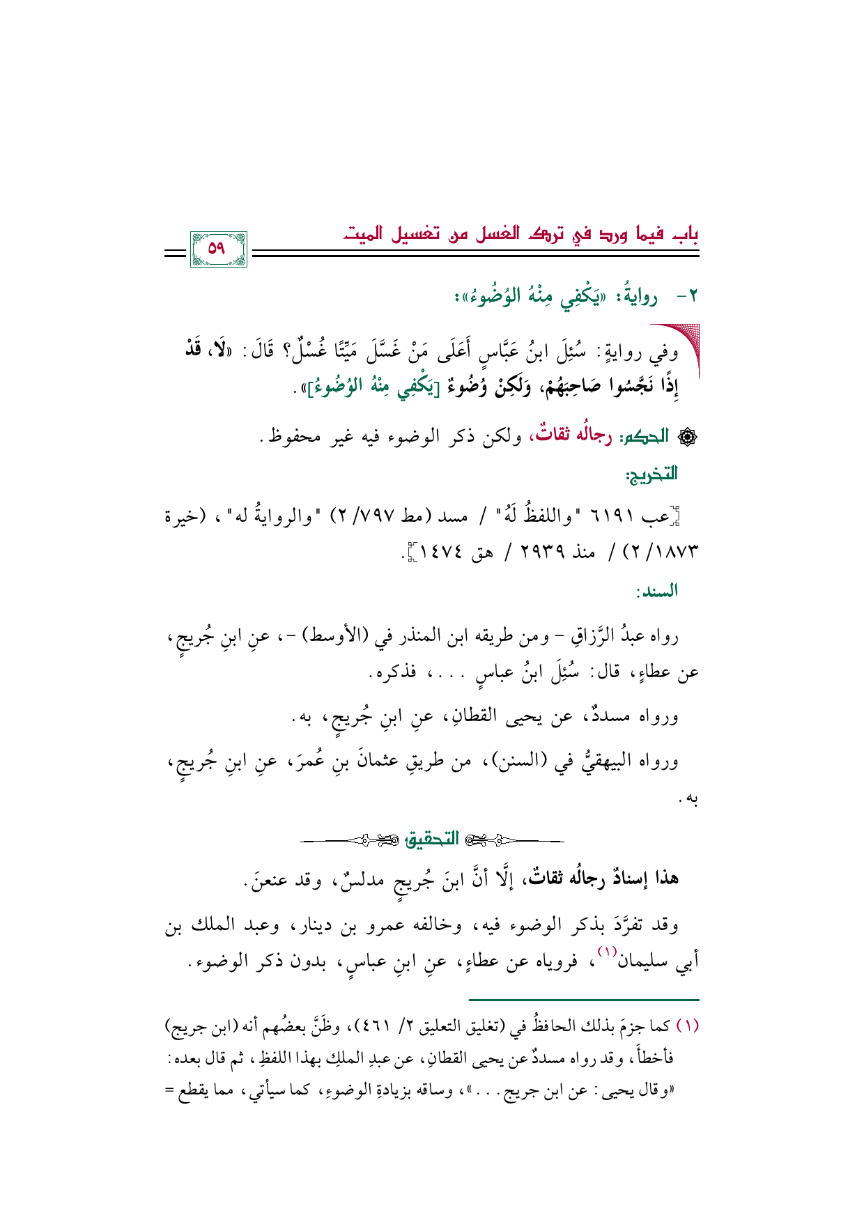 (¬١) كما جزمَ بذلك الحافظُ في (تغليق التعليق ٢/ ٤٦١)، وظَنَّ بعضُهم أنه (ابن جريج) فأخطأَ، وقد رواه مسددٌ عن يحيى القطانِ، عن عبدِ الملكِ بهذا اللفظِ، ثم قال بعده: "وقال يحيى: عن ابن جريج ... "، وساقه بزيادةِ الوضوءِ، كما سيأتي، مما يقطع أن مراد يحيى: هو عبد الملك (ابن أبي سليمان)، وهذا هو المشهورُ من صنيعهم -غالبًا-؛ أنهم إذا أطلقوا (عبد الملك عن عطاء)، فمرادهم (ابن أبي سليمان)، وأما إذا أرادوا عبد الملك ابن جريج، فيقولون (ابن جريج)، والله أعلم.