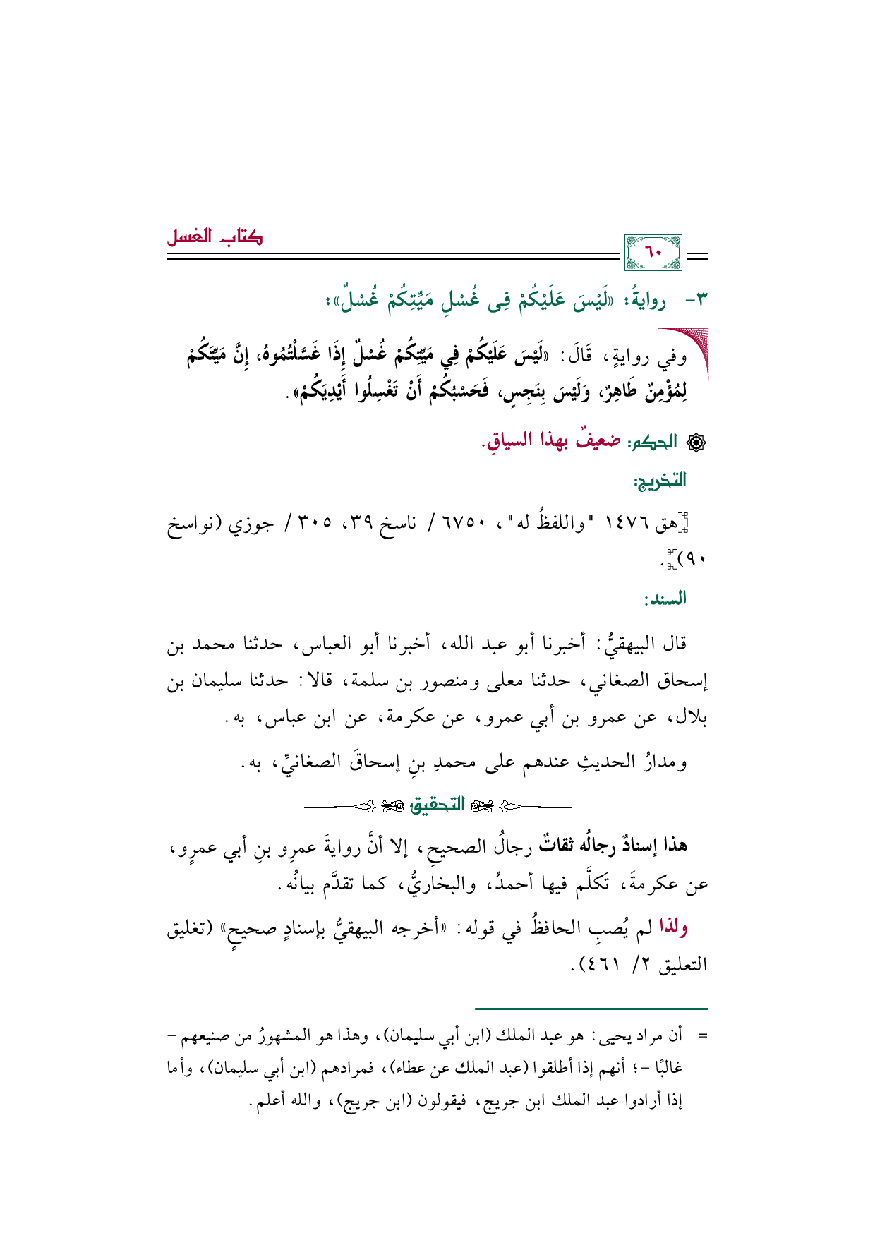 قال البيهقيُّ: أخبرنا أبو عبد الله، أخبرنا أبو العباس، حدثنا محمد بن إسحاق الصغاني، حدثنا معلى ومنصور بن سلمة، قالا: حدثنا سليمان بن بلال، عن عمرو بن أبي عمرو، عن عكرمة، عن ابن عباس، به.