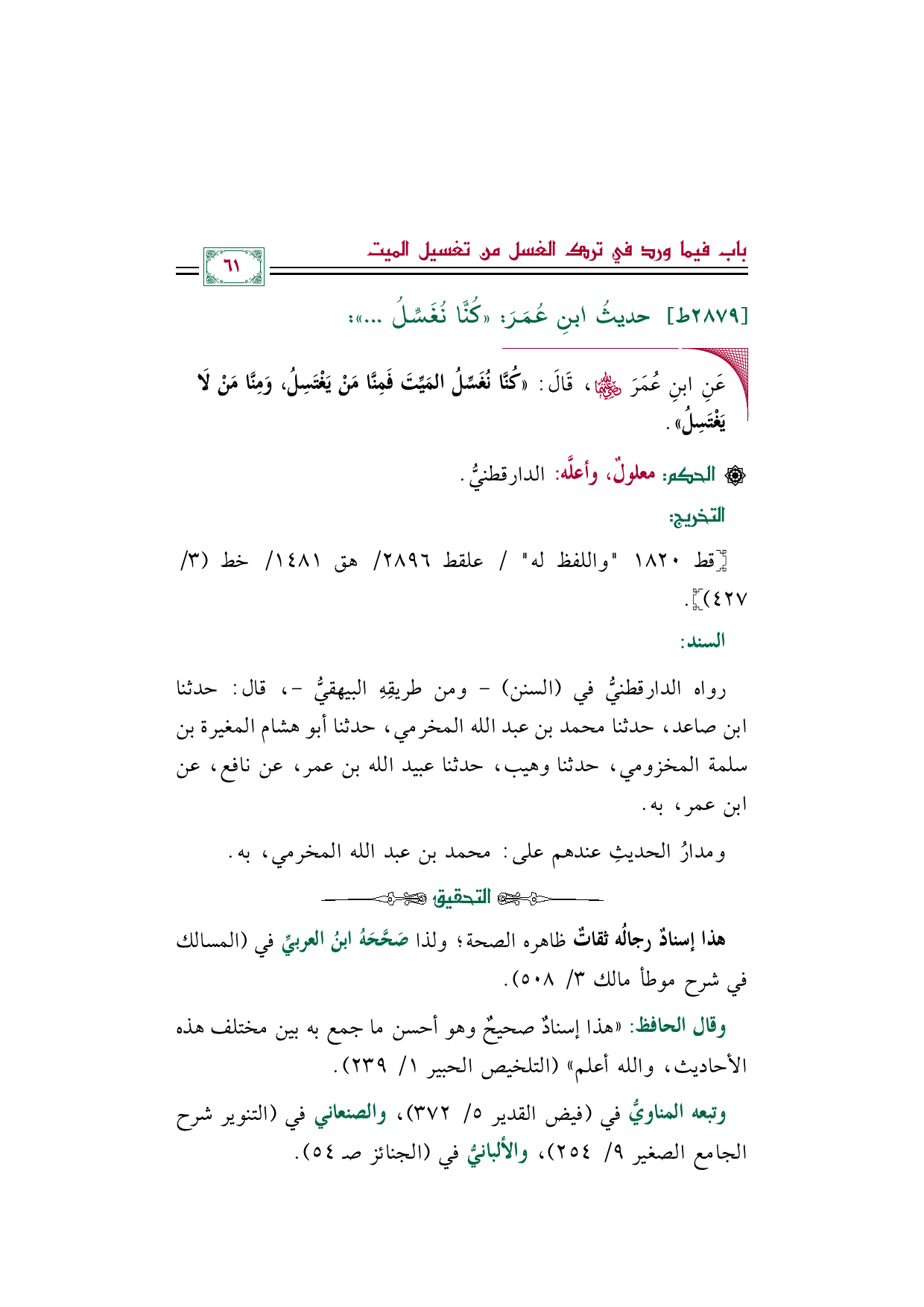 رواه الدارقطنيُّ في (السنن) -ومن طريقِهِ البيهقيُّ-، قال: حدثنا ابن صاعد، حدثنا محمد بن عبد الله المخرمي، حدثنا أبو هشام المغيرة بن سلمة المخزومي، حدثنا وهيب، حدثنا عبيد الله بن عمر، عن نافع، عن ابن عمر، به.