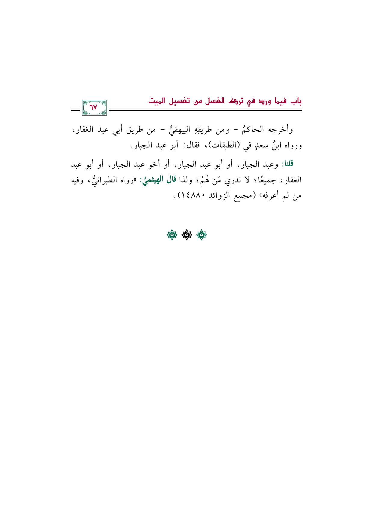 قلنا: وعبد الجبار، أو أبو عبد الجبار، أو أخو عبد الجبار، أو أبو عبد الغفار، جميعًا؛ لا ندري مَن هُمْ؛ ولذا قال الهيثميُّ: "رواه الطبرانيُّ، وفيه من لم أعرفه" (مجمع الزوائد ١٤٨٨٠).