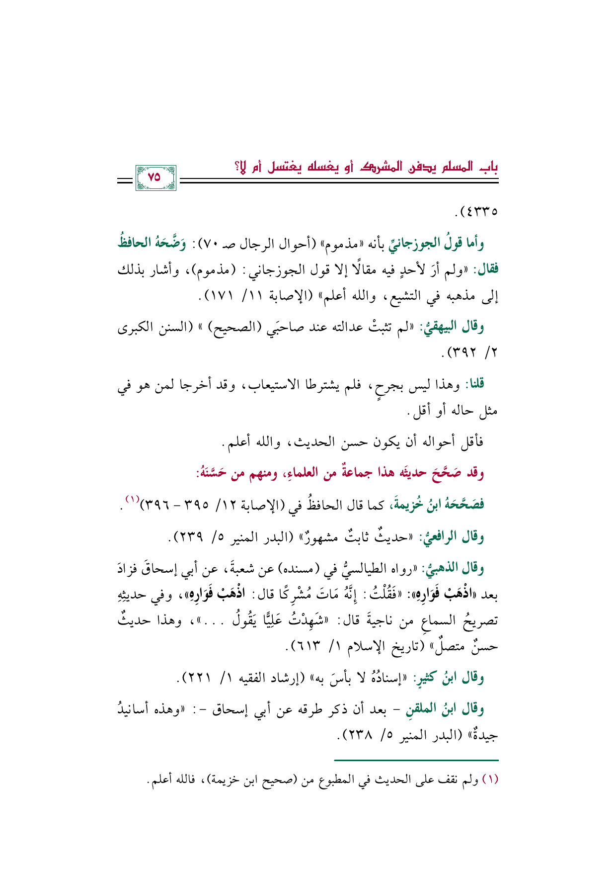 فصَحَّحَهُ ابنُ خُزيمةَ، كما قال الحافظُ في (الإصابة ١٢/ ٣٩٥ - ٣٩٦) (¬١).